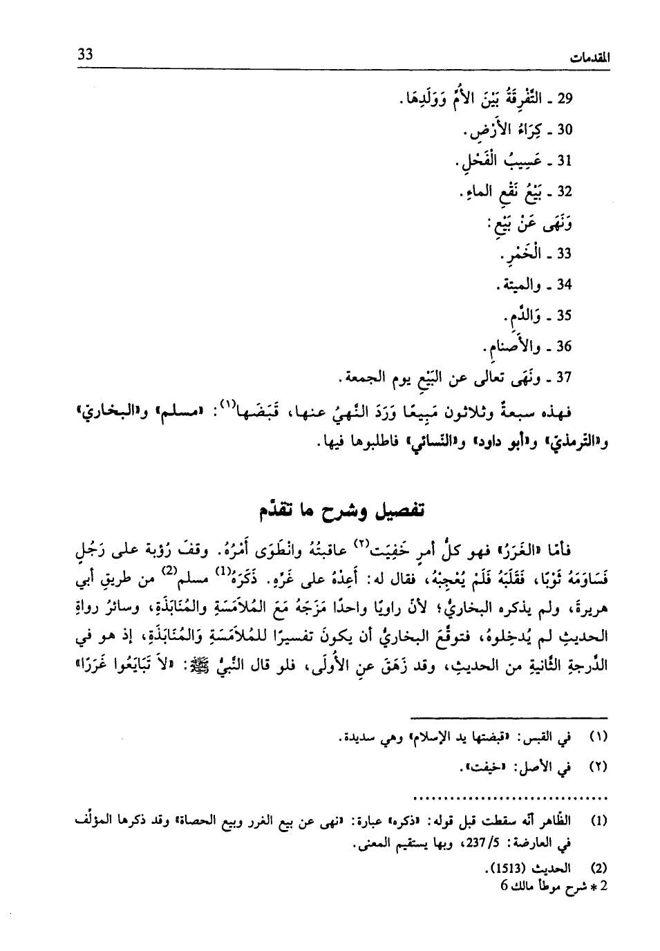 (¬1) الظّاهر أنّه سقطت قبل قوله: "ذكره" عبارة: "نهى عن بيع الغرر وبيع الحصاة" وقد ذكرها المؤلّف في العارضة: 5/ 237، وبها يستقيم المعنى.