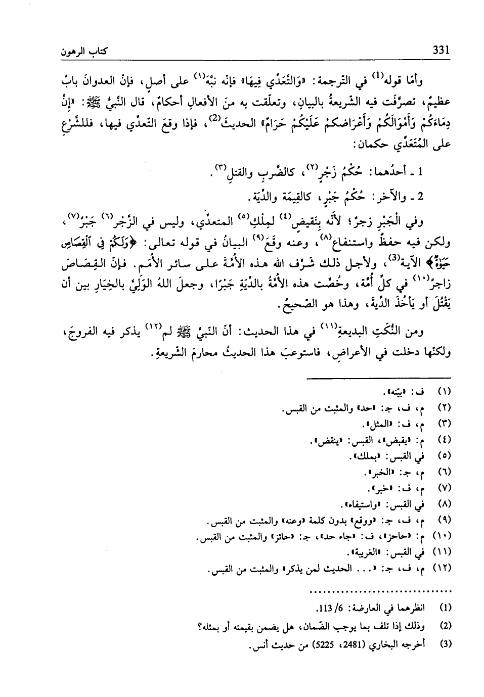 وأمّا قوله (¬1) في التّرجمة: "والتَّعَدِّي فِيها" فإنّه نبَّهَ على أصلٍ، فإنّ العدوانَ بابٌ عظيم، تصرَّفَت فيه الشّريعةُ بالبيانِ، وتعلّقت به منَ الأفعالِ أحكامٌ، قال النّبيُّ -صلّى الله عليه وسلم-: "إِنَّ دِمَاءَكُم وَأَموَالَكُم وأَعْرَاضكم عَلَيكُم حَرامٌ" الحديثَ (¬2)، فإذا وقعَ التّعدِّي فيها، فللشَّرعِ على المُتَعَدِّي حكمان: