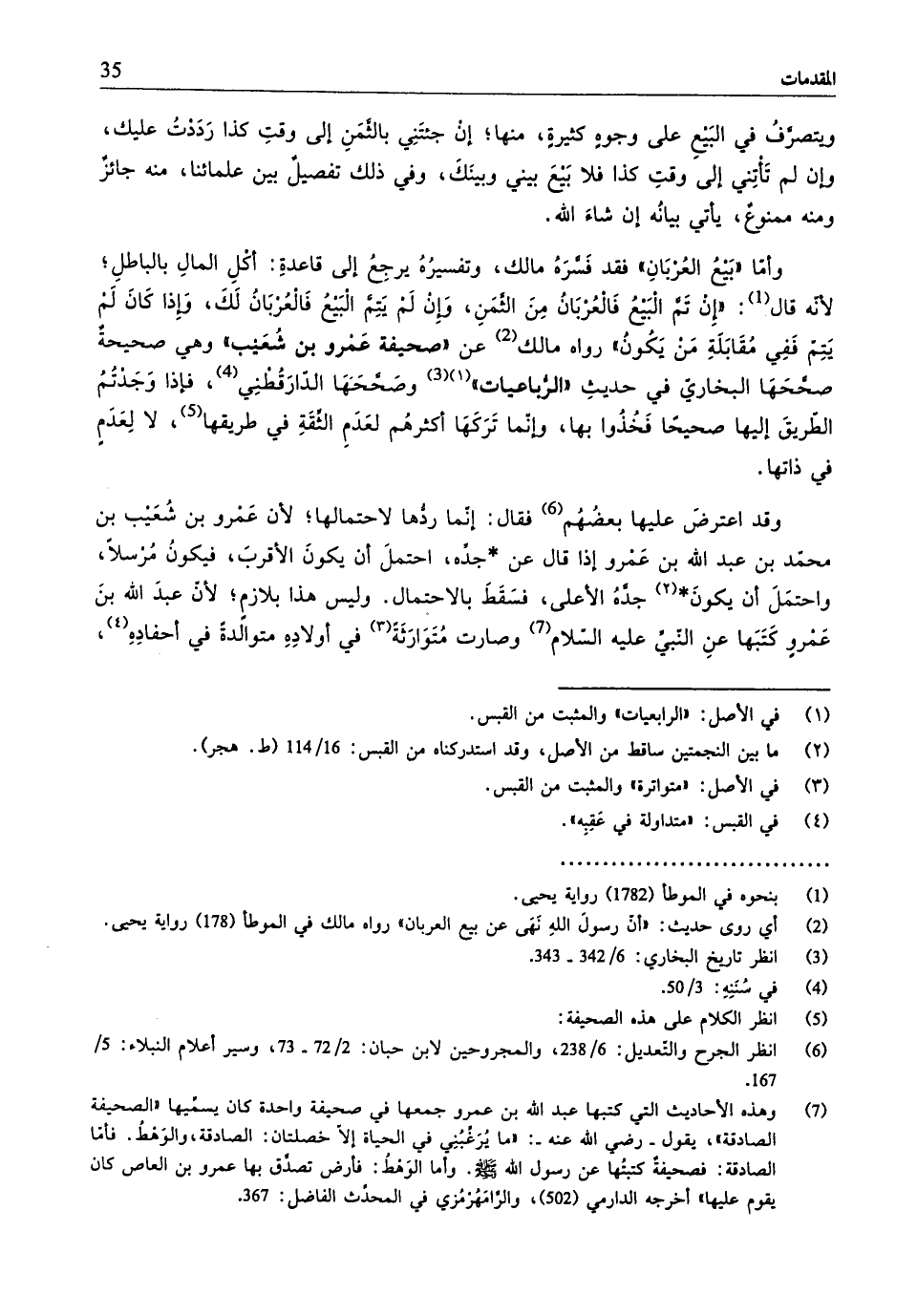 وأمّا "بَيْعُ العُرْبَانِ" فقد فَسَّرَهُ مالك، وتفسيرُهُ يرجِعُ إلى قاعدةِ: أكْلِ المالِ بالباطلِ؛ لأنَّه قال (¬1): "إِنْ تَمَّ الْبَيْعُ فَالْعُرْبَانُ مِنَ الثَّمَنِ، وَإِنْ لَمْ يَتِمَّ الْبَيْعُ فَالْعُرْبَانُ لَكَ، وَإِذا كَانَ لَمْ يَتِمّ فَفِي مُقَابَلَةِ مَنْ يَكُونُ" رواه مالك (¬2) عن "صحيفة عَمْرو بن شُعَيْب" وهي صحيحةٌ صحَّحَهَا البخاريّ في حديثِ "الرُّباعيات" (¬3) وصحَّحَهَا الدَّارَقُطْنِي (¬4)، فإذا وَجَدْتُمُ الطريقَ إليها صحيحًا فَخُذُوا بها، وإنّما تَرَكَهَا أكثرهُم لعَدَمِ الثِّقَةِ في طريقها (¬5)، لا لِعَدَمٍ في ذاتها.