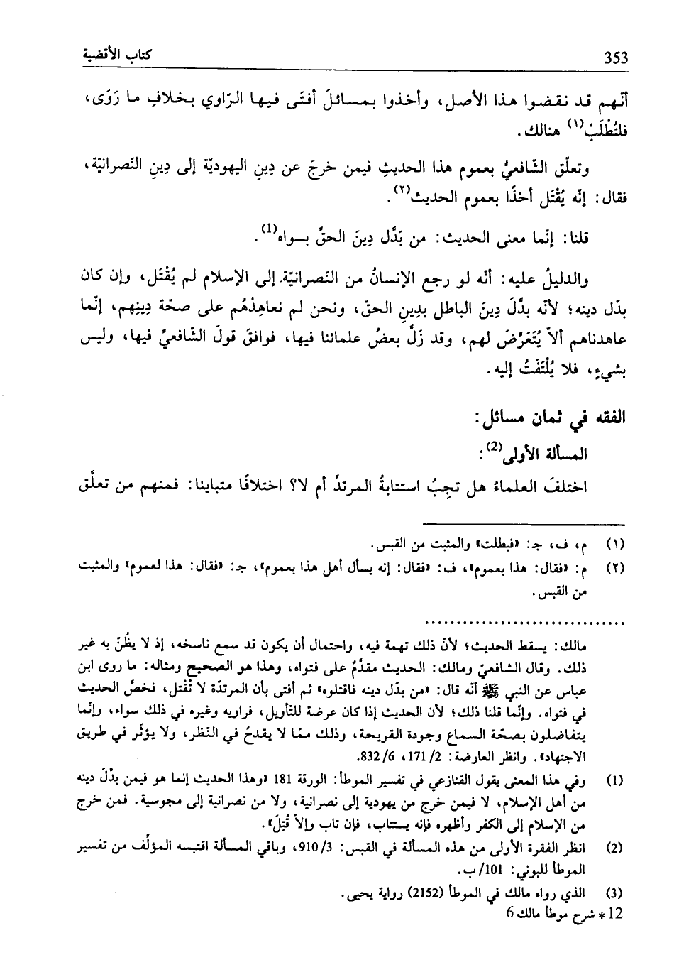 (¬1) وفي هذا المعنى يقول القنازعي في تفسير الموطَّأ: الورقة 181 "وهذا الحديث إنّما هو فيمن بدَّلَ دينه من أهل الإسلام، لا فيمن خرج من يهودية إلى نصرانية، ولا من نصرانية إلى مجوسية. فمن خرج من الإسلام إلى الكفر وأظهره فإنّه يستتاب، فإن تاب وإلَّا قُتِلَ".