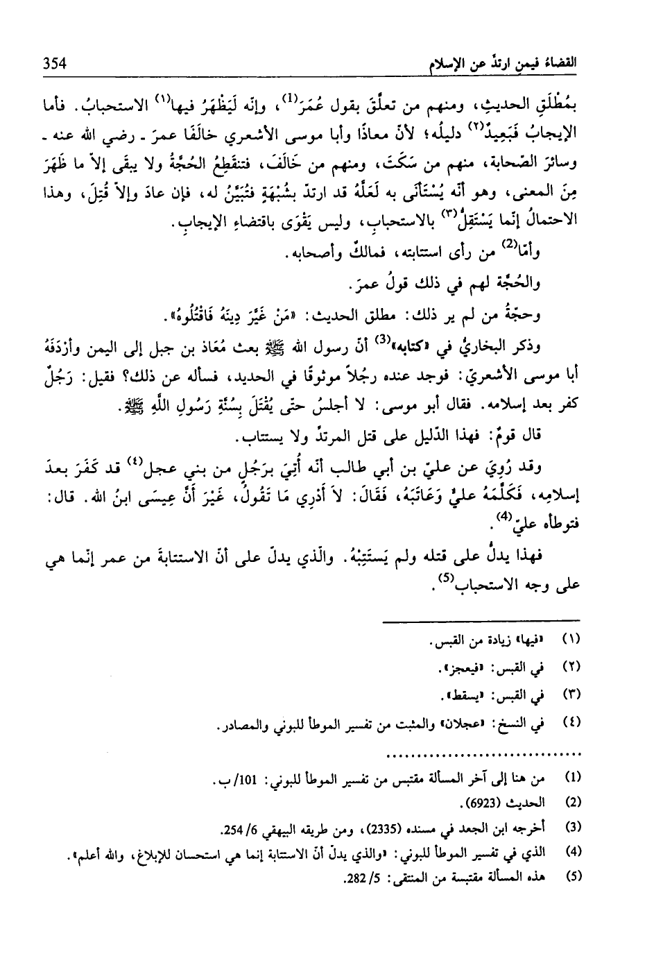 (¬5) الّذي في تفسير الموطَّأ للبوني: "والذي يدلُّ أنّ الاستتابة إنّما هي استحسان للإبلاغ، والله أعلم".
