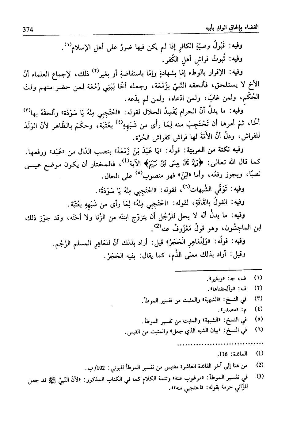(¬2) في تفسير الموطَّأ: "مرغوب عنه" وتتمة الكلام كما في الكتاب المذكور: " "لأنّ النّبيّ - صلّى الله عليه وسلم - قد جعل للزّاني حرمة بقوله: "احتجبي منه".