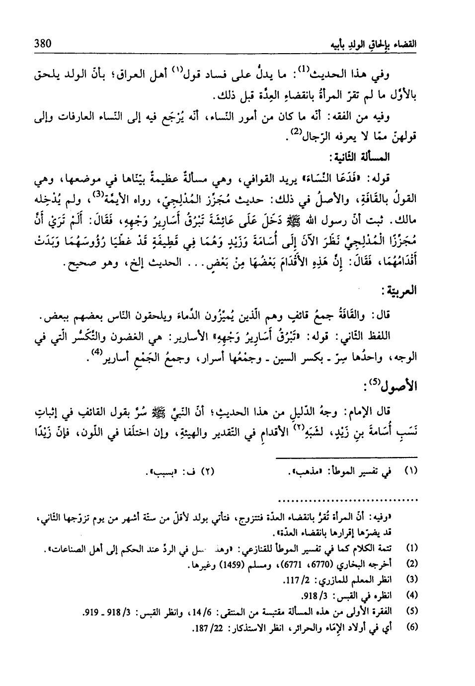 قال الإمام: وجهُ الدّليلِ من هذا الحديث؛ أنّ النّبيّ - صلّى الله عليه وسلم - سُرَّ بقول القائف في إثباتِ نَسَبِ أُسَامةَ بنِ زَيدٍ، لشَبَهِ الأقدامِ في التّقدير والهيئةِ، وإن اختلَفا في اللّون، فإنّ زَيدًا