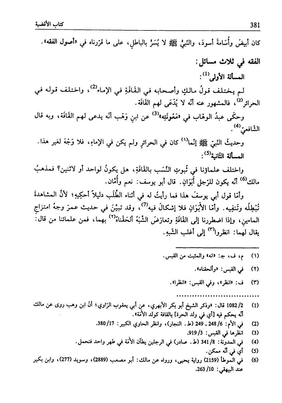 (¬3) 2/ 1082 قال: "وذكر الشّيخ أبو بكر الأبهري، عن أبي يعقوب الرّاوي؛ أنّ ابن وهب روى عن مالك أنّه يحكم فيه [أي في ولد الحرة] بالقَافَة كولد الأُمَّة".