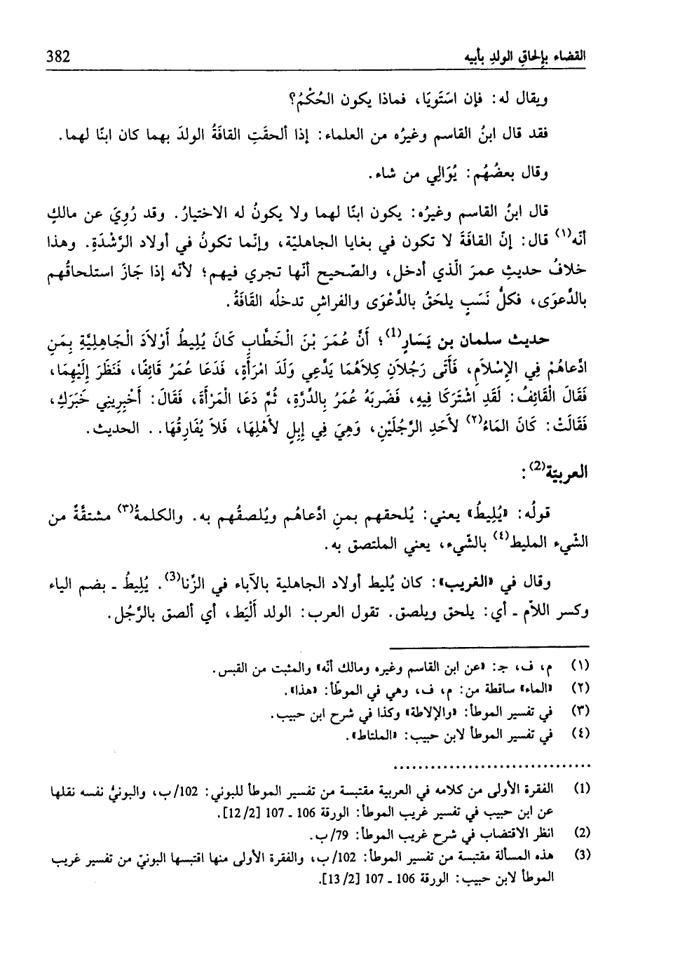 (¬2) الفقرة الأولى من كلامه في العربيّة مقتبسة من تفسير الموطَّأ للبوني: 102/ ب، والبونيُّ نفسه نقلها عن ابن حبيب في تفسير غريب الموطَّأ: الورقة 106 - 107 [2/ 12].