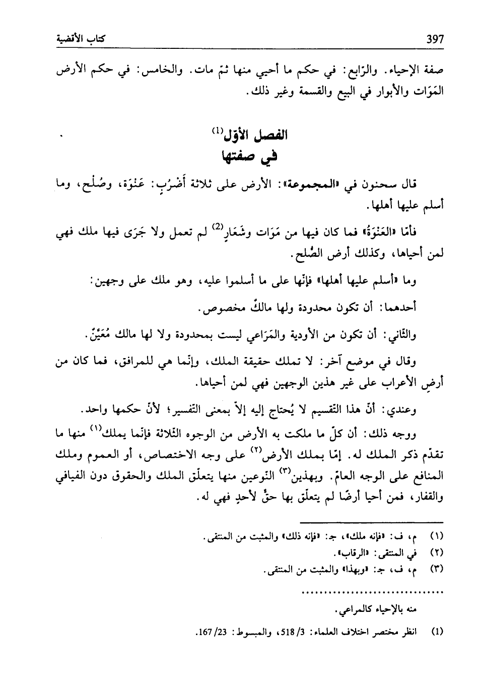 قال سحنون في "المجموعة": الأرض على ثلاثة أَضرُبٍ: عَنْوَة، وصُلح، وما أسلم عليها أهلها.
