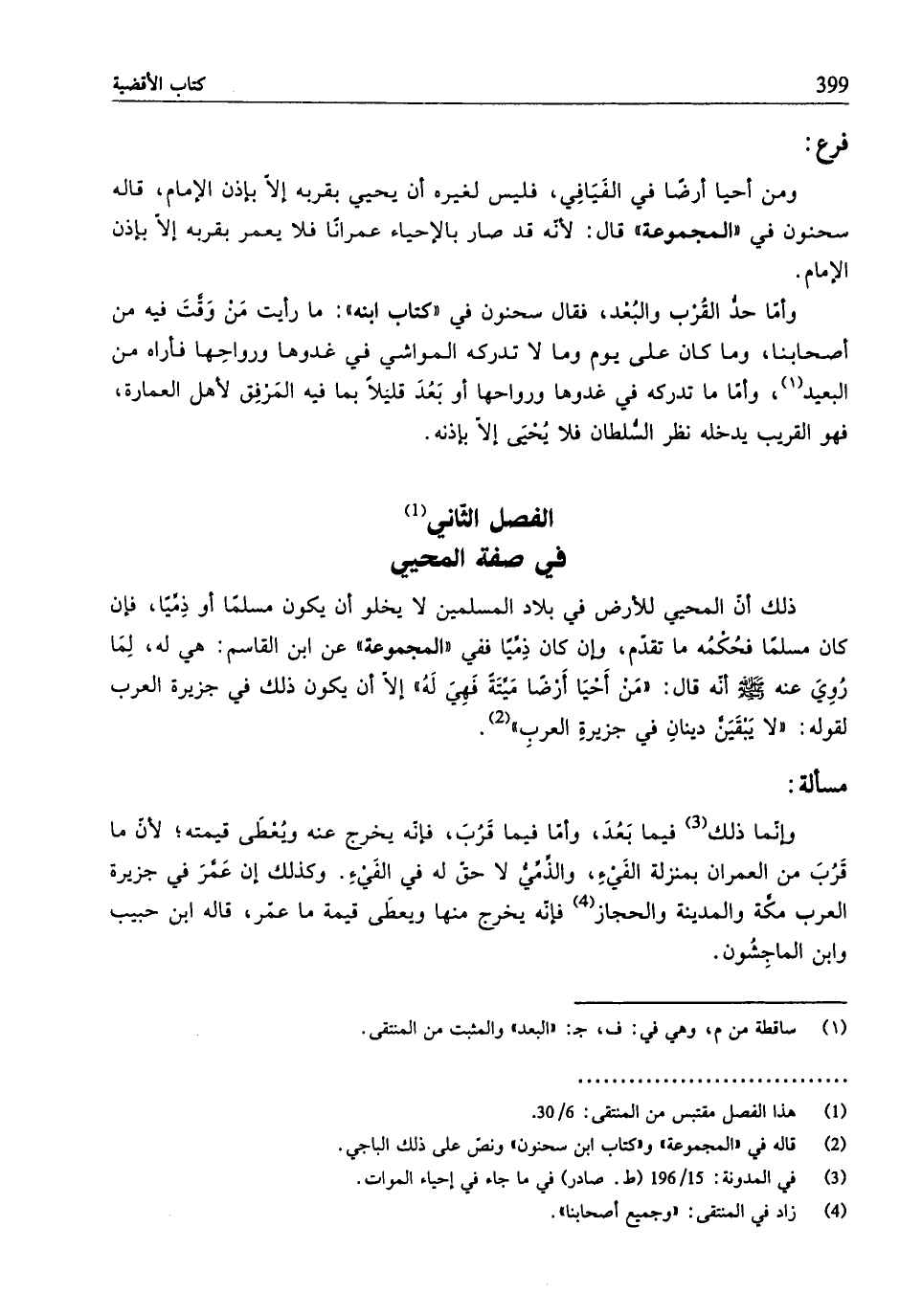 ذلك أنّ المحيي للأرض في بلاد المسلمين لا يخلو أنّ يكون مسلمًا أو ذِمِّيًا، فإن كان مسلمًا فحُكمُه ما تقدّم، وإن كان ذِمِّيًا ففي "المجموعة" عن ابن القاسم: هي له، لِمَا رُوِيَ عنه - صلّى الله عليه وسلم - أنّه قال: "مَنْ أَحيَا أَرضًا مَيّتَةً فَهِيَ لَهُ" إلّا أنّ يكون ذلك في جزيرة العرب لقوله: "لا يَبقَيَنَّ دينانِ في جزيرةِ العربِ" (¬2).