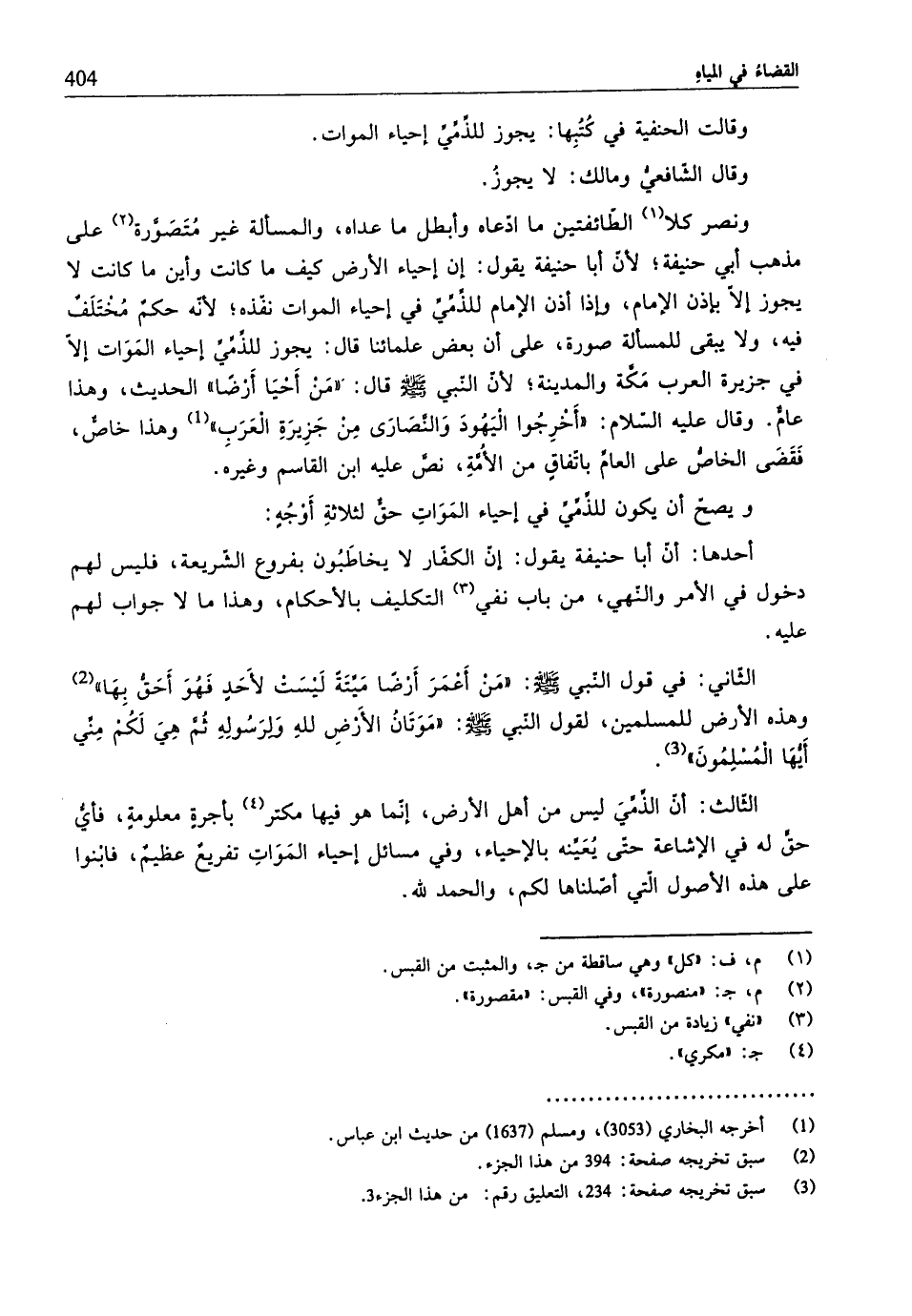 الثّالث: أنّ الذِّمِّيّ ليس من أهل الأرض، إنّما هو فيها مكتر بأجرةٍ معلومةٍ، فأيُّ حقٌّ له في الإشاعة حتّى يُعَيِّنه بالإحياء، وفي مسائل إحياء المَوَاتِ تفريعٌ عظيمٌ، فابْنوا على هذه الأصول الّتي أصّلناها لكم، والحمد لله.