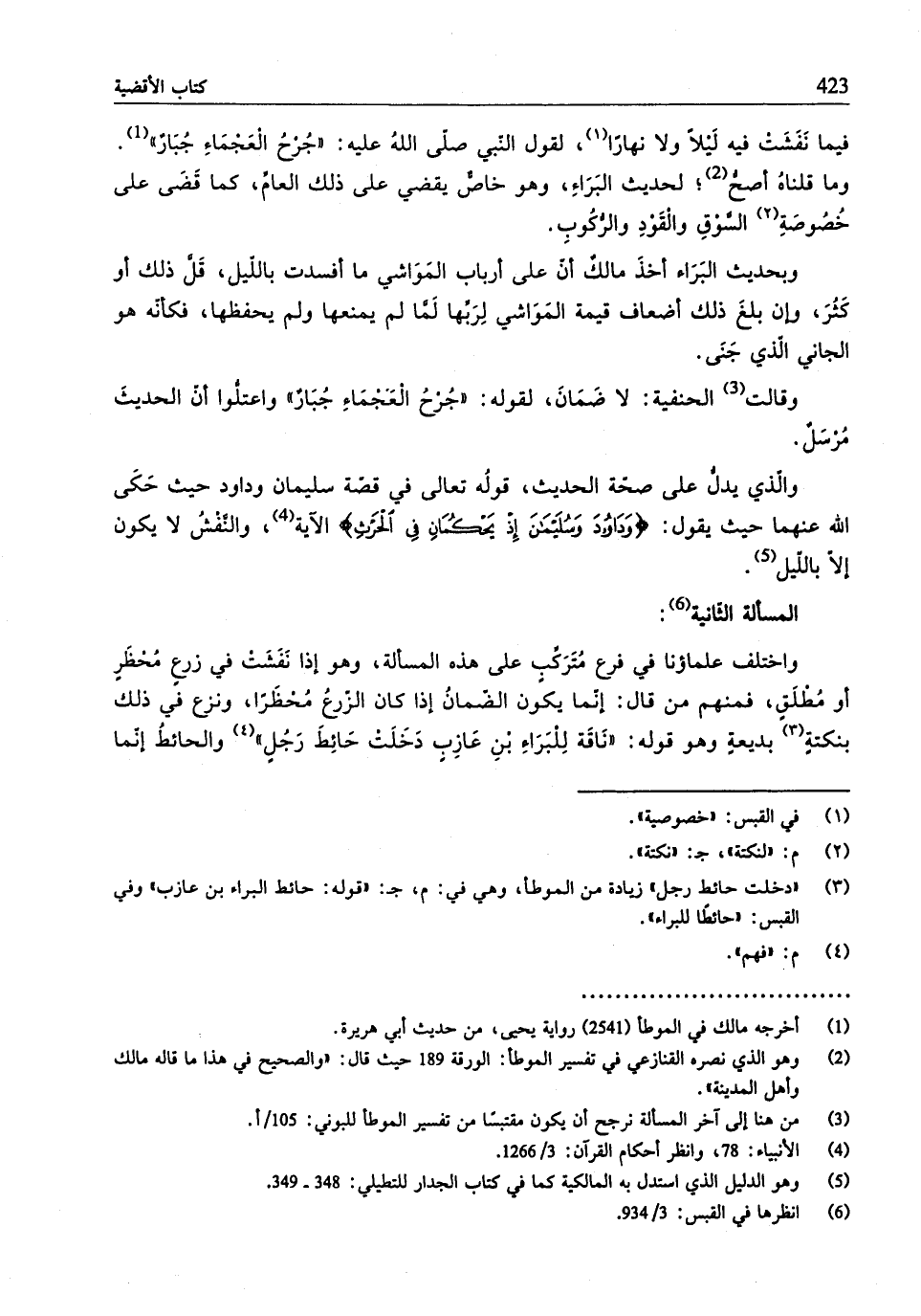 فيما نَفَشَت فيه لَيلًا ولا نهارًا، لقول النّبيّ صلّى اللهُ عليه وسلم: "جُرْحُ العَجْمَاءِ جُبارٌ" (¬1). وما قلناهُ أصحُّ (¬2)؛ لحديث البَرَاءِ، وهو خاصٌّ يقضي على ذلك العامِّ، كما قَضَى على خُصُوصَةِ السَّوقِ والقَودِ والرُّكُوبِ.