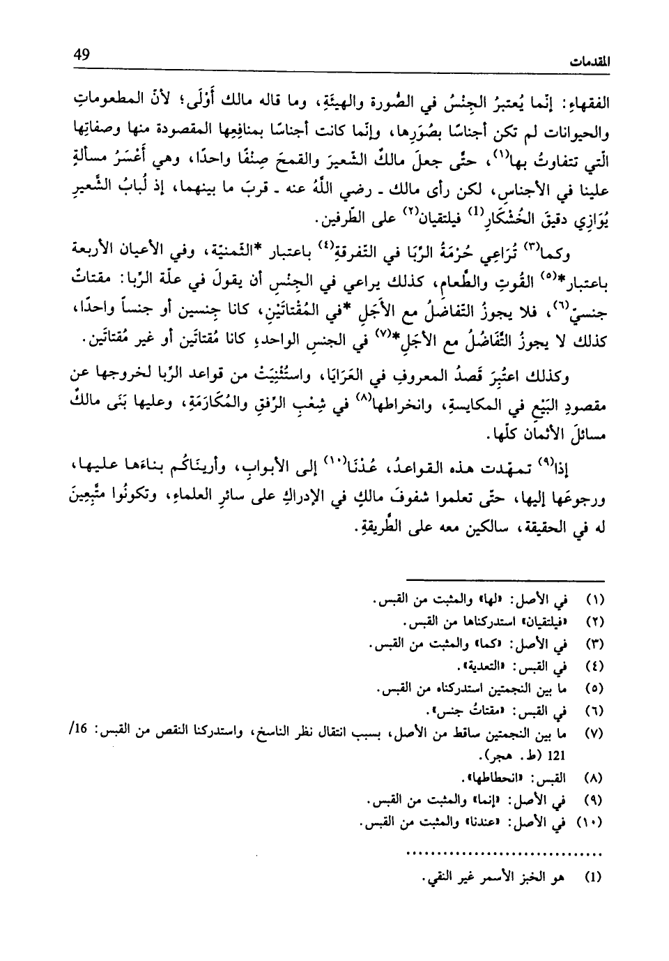 الفقهاءِ: إنّما يُعتبرُ الجِنْسُ في الصُّورة والهيئَةِ، وما قاله مالك أَوْلَى؟ لأنّ المطعوماتِ والحيوانات لم تكن أجناسًا بصُوَرِها، وإنّما كانت أجناسًا بمنافِعِها المقصودة منها وصفاتِها الّتي تتفاوتُ بها، حتَّى جعلَ مالكٌ الشّعيرَ والقمحَ صِنْفًا واحدًا، وهي أَعْسَرُ مسألةٍ علينا في الأجناسِ، لكن رأى مالك - رضي اللهُ عنه - قربَ ما بينهما، إذ لُبابُ الشَّعيرِ يُوَازِي دقيقَ الخُشْكَارِ (¬1) فيلتقيان على الطّرفين.