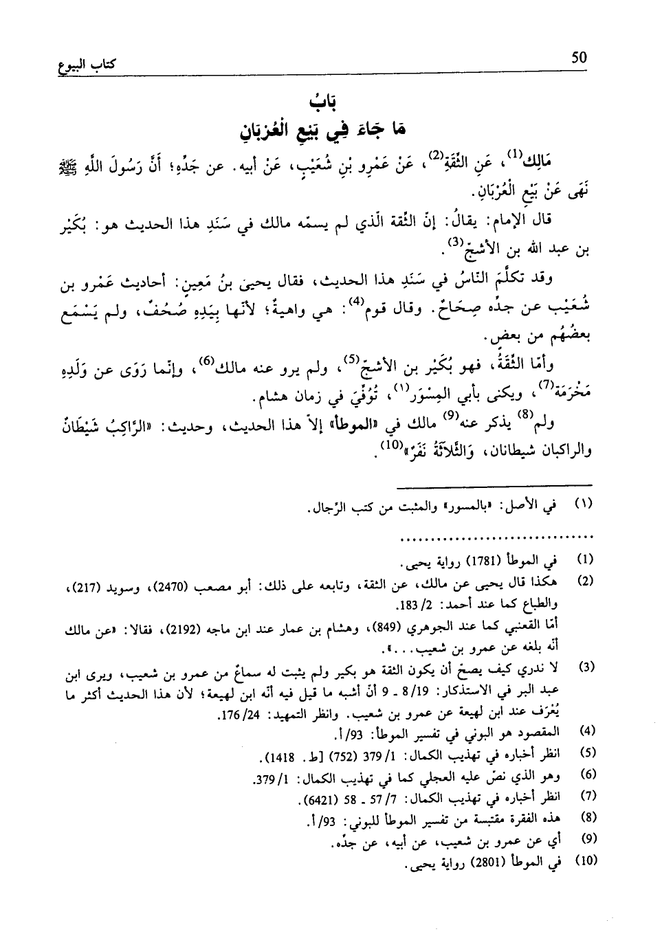 (¬3) لا ندري كيف يصحّ أنّ يكون الثقة هو بكير ولم يثبت له سماعٌ من عمرو بن شعيب، ويرى ابن عبد البرّ في الاستذكار: 19/ 8 - 9 أنّ أشبه ما قيل فيه أنّه ابن لهيعة؛ لأنّ هذا الحديث أكثر ما يُعْرَف عند ابن لهيعة عن عمرو بن شعيب. وانظر التمهيد: 24/ 176.