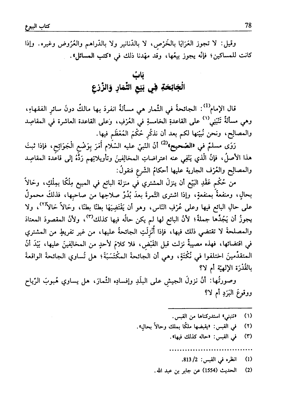رَوَى مسلمٌ في "الصّحيح" (¬2) أنّ النَّبىِّ -عليه السّلام- أَمَرَ بِوضعِ الجَوَائِحِ، فإذا ثبتَ هذا الأصلُ، فإنّ الّذي يَنْفِي عنه اعتراضاتِ المخالِفينَ وتأويلاتِهم رَدُّهُ إلى قاعدة المقاصِد والمصالح والعُرف الجارية عليها أحكامُ الشّرعِ فنقولُ: