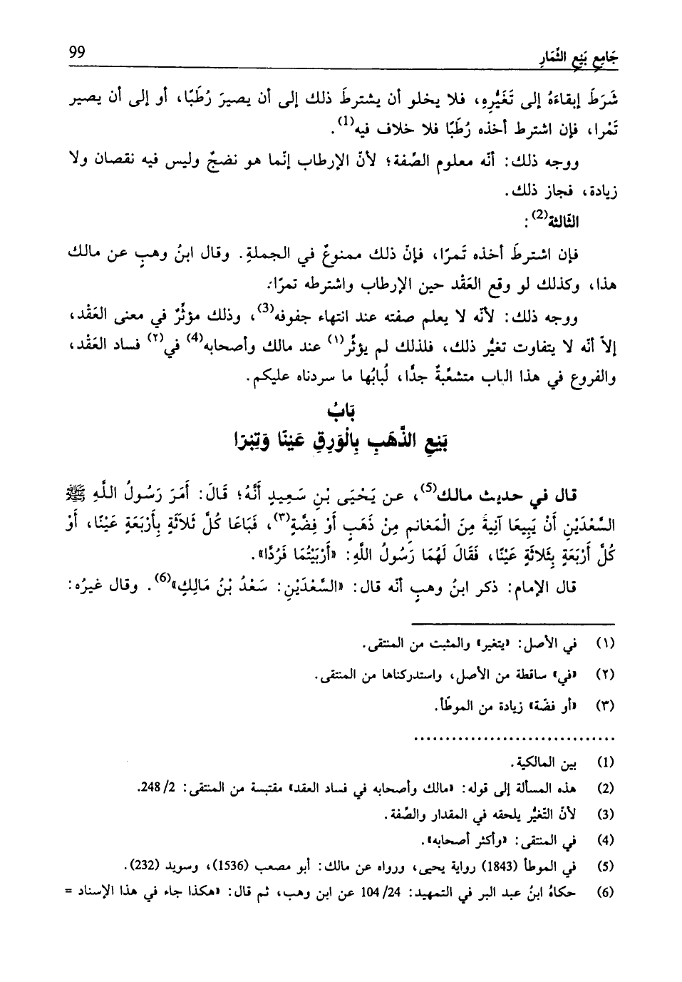 قال في حديث مالك (¬5)، عن يَحيَى بنِ سَعِيدِ أَنَّهُ؛ قَالَ: أَمَرَ رَسُولُ اللهِ - صلّى الله عليه وسلم - السَّعدَينِ أنّ يَبيعَا آنِيةً مِنَ المَغانمِ مِنْ ذهَبٍ أَو فِضَّةٍ، فَبَاعَا كُلَّ ثَلَاثَةٍ بِأربَعَةٍ عَينًا، أَوْ كُلَّ أَربَعَةٍ بثَلاثَةٍ عَينًا، فَقَالَ لَهُمَا رَسُولُ اللهِ: "أَربَيتُمَا فَرُدَّا".