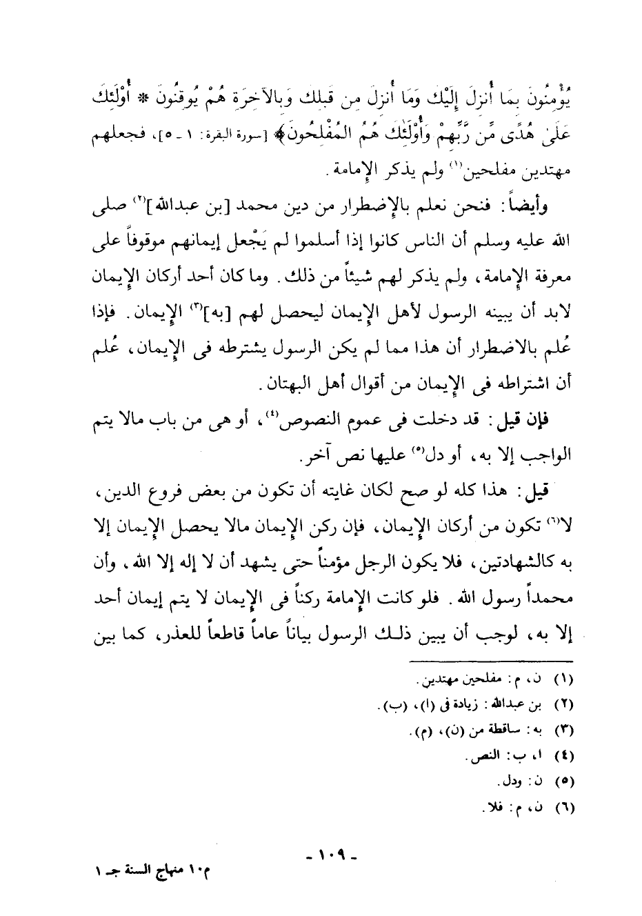فَجَعَلَهُمْ مُهْتَدِينَ مُفْلِحِينَ (¬1) ، وَلَمْ يَذْكُرِ الْإِمَامَةَ.