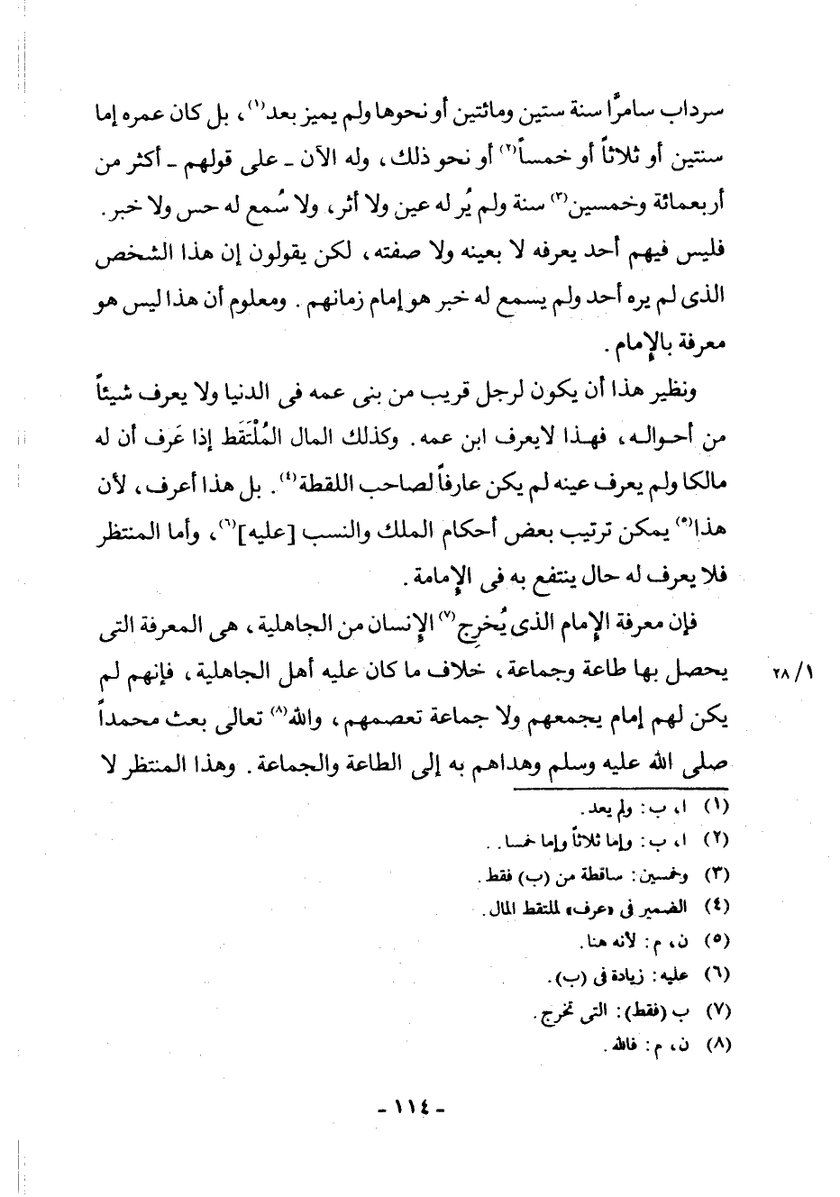 فَإِنَّ مَعْرِفَةَ الْإِمَامِ الَّذِي يُخْرِجُ (¬7) الْإِنْسَانَ مِنَ الْجَاهِلِيَّةِ هِيَ الْمَعْرِفَةُ الَّتِي يَحْصُلُ بِهَا طَاعَةٌ وَجَمَاعَةٌ، خِلَافَ مَا كَانَ عَلَيْهِ أَهْلُ الْجَاهِلِيَّةِ، فَإِنَّهُمْ لَمْ يَكُنْ لَهُمْ إِمَامٌ يَجْمَعُهُمْ، وَلَا جَمَاعَةٌ تَعْصِمُهُمْ، وَاللَّهُ (¬8) تَعَالَى بَعَثَ مُحَمَّدًا - صَلَّى اللَّهُ عَلَيْهِ وَسَلَّمَ -، وَهَدَاهُمْ بِهِ إِلَى الطَّاعَةِ، وَالْجَمَاعَةِ، وَهَذَا الْمُنْتَظَرُ لَا.