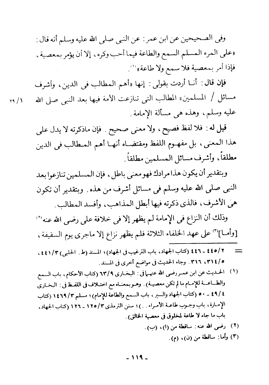 فَإِنْ قَالَ: أَنَا أَرَدْتُ بِقَوْلِي إِنَّهَا (أَهَمُّ الْمَطَالِبِ فِي الدِّينِ، وَأَشْرَفُ مَسَائِلِ الْمُسْلِمِينَ.) الْمَطَالِبُ الَّتِي تَنَازَعَتِ الْأُمَّةُ فِيهَا بَعْدَ النَّبِيِّ - صَلَّى اللَّهُ عَلَيْهِ وَسَلَّمَ -، وَهَذِهِ هِيَ مَسْأَلَةُ الْإِمَامَةِ.