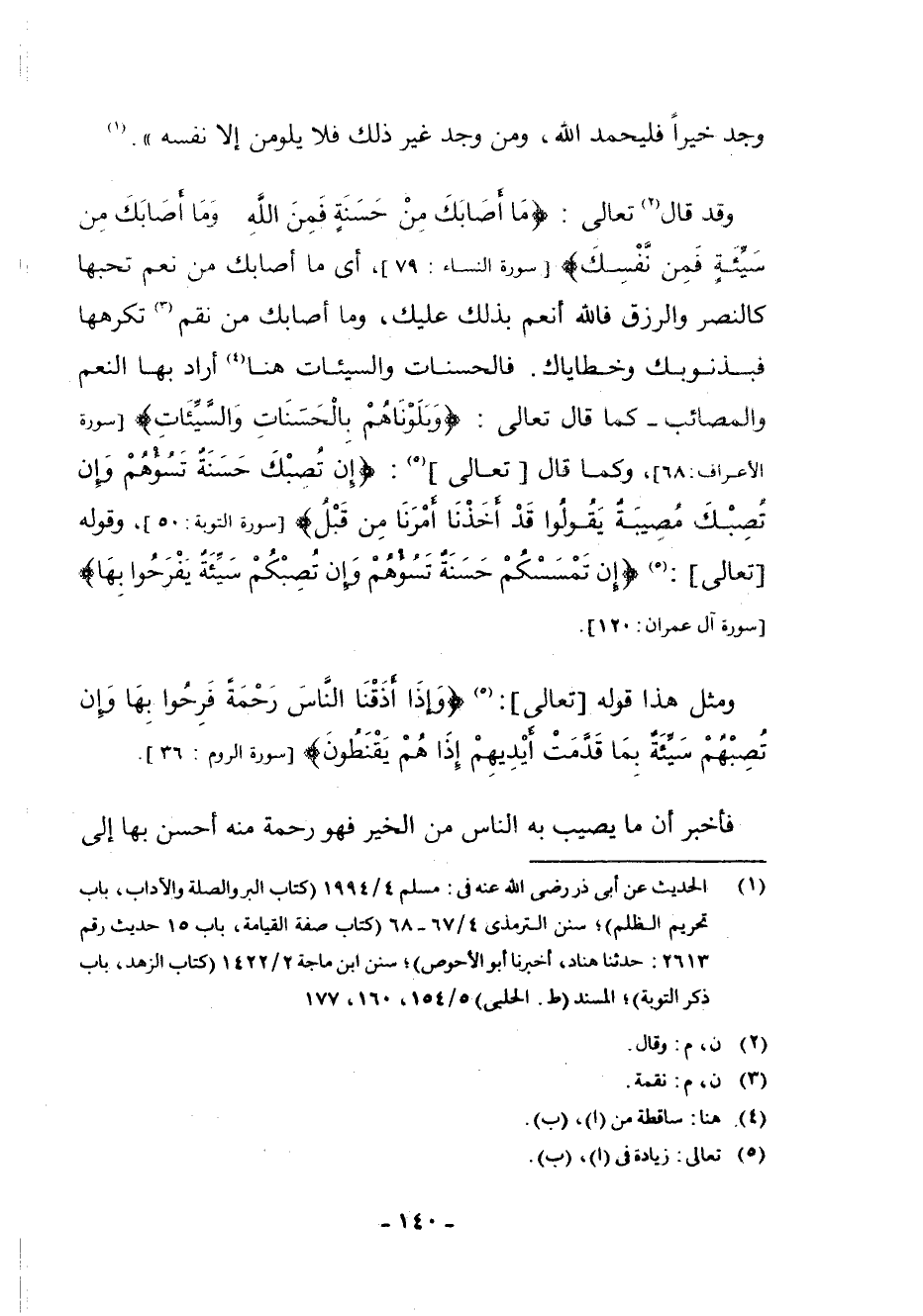 وَقَدْ قَالَ (¬2) تَعَالَى: {مَا أَصَابَكَ مِنْ حَسَنَةٍ فَمِنَ اللَّهِ وَمَا أَصَابَكَ مِنْ سَيِّئَةٍ فَمِنْ نَفْسِكَ} [سُورَةُ النِّسَاءِ: 79] أَيْ مَا أَصَابَكَ مِنْ نِعَمٍ تُحِبُّهَا كَالنَّصْرِ، وَالرِّزْقِ، فَاللَّهُ أَنْعَمَ بِذَلِكَ عَلَيْكَ، وَمَا أَصَابَكَ مِنْ نِقَمٍ (¬3) تَكْرَهُهَا، فَبِذُنُوبِكَ، وَخَطَايَاكَ، فَالْحَسَنَاتُ، وَالسَّيِّئَاتُ هُنَا (¬4) أَرَادَ بِهَا النِّعَمَ، وَالْمَصَائِبَ، كَمَا قَالَ تَعَالَى: {وَبَلَوْنَاهُمْ بِالْحَسَنَاتِ وَالسَّيِّئَاتِ} [سُورَةُ الْأَعْرَافِ: 68] ، وَكَمَا قَالَ [تَعَالَى] (¬5) : {إِنْ تُصِبْكَ حَسَنَةٌ تَسُؤْهُمْ وَإِنْ تُصِبْكَ مُصِيبَةٌ يَقُولُوا قَدْ أَخَذْنَا أَمْرَنَا مِنْ قَبْلُ} [سُورَةُ التَّوْبَةِ: 50] ، وَقَوْلِهِ تَعَالَى: {إِنْ تَمْسَسْكُمْ حَسَنَةٌ تَسُؤْهُمْ وَإِنْ تُصِبْكُمْ سَيِّئَةٌ يَفْرَحُوا بِهَا} [سُورَةُ آلِ عِمْرَانَ: 120] .