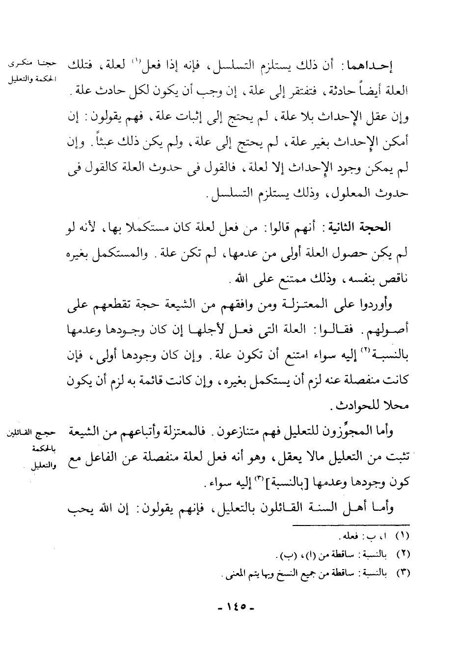 وَأَمَّا الْمُجَوِّزُونَ لِلتَّعْلِيلِ، فَهُمْ مُتَنَازِعُونَ، فَالْمُعْتَزِلَةُ وَأَتْبَاعُهُمْ مِنَ الشِّيعَةِ تُثْبِتُ مِنَ التَّعْلِيلِ مَا لَا يُعْقَلُ، وَهُوَ أَنَّهُ فَعَلَ لِعِلَّةٍ مُنْفَصِلَةٍ عَنِ الْفَاعِلِ مَعَ كَوْنِ وُجُودِهَا وَعَدَمِهَا [بِالنِّسْبَةِ] (¬3) إِلَيْهِ سَوَاءً.