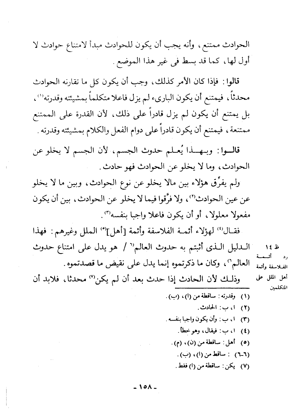 قَالُوا: فَإِذَا كَانَ الْأَمْرُ كَذَلِكَ. وَجَبَ أَنْ يَكُونَ كُلُّ مَا تُقَارِنُهُ الْحَوَادِثُ مُحْدَثًا، فَيَمْتَنِعُ أَنْ يَكُونَ الْبَارِئُ لَمْ يَزَلْ فَاعِلًا مُتَكَلِّمًا بِمَشِيئَتِهِ، وَقُدْرَتِهِ (¬1) .