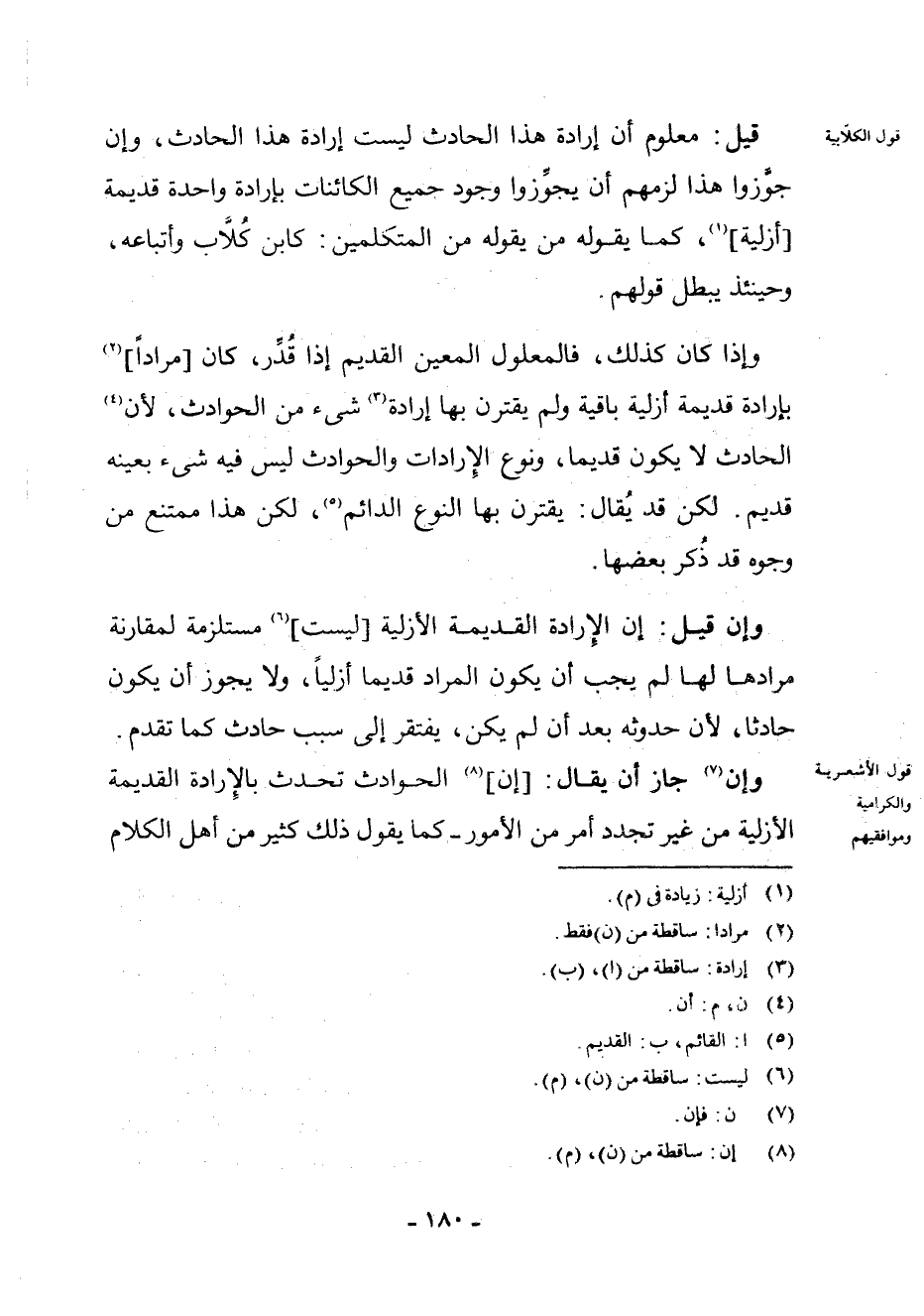 وَإِنْ (¬7) جَازَ أَنْ يُقَالَ: [إِنَّ] (¬8) الْحَوَادِثَ تَحْدُثُ بِالْإِرَادَةِ الْقَدِيمَةِ الْأَزَلِيَّةِ مِنْ غَيْرِ تَجَدُّدِ أَمْرٍ مِنَ الْأُمُورِ - كَمَا يَقُولُ ذَلِكَ كَثِيرٌ مِنْ أَهْلِ الْكَلَامِ