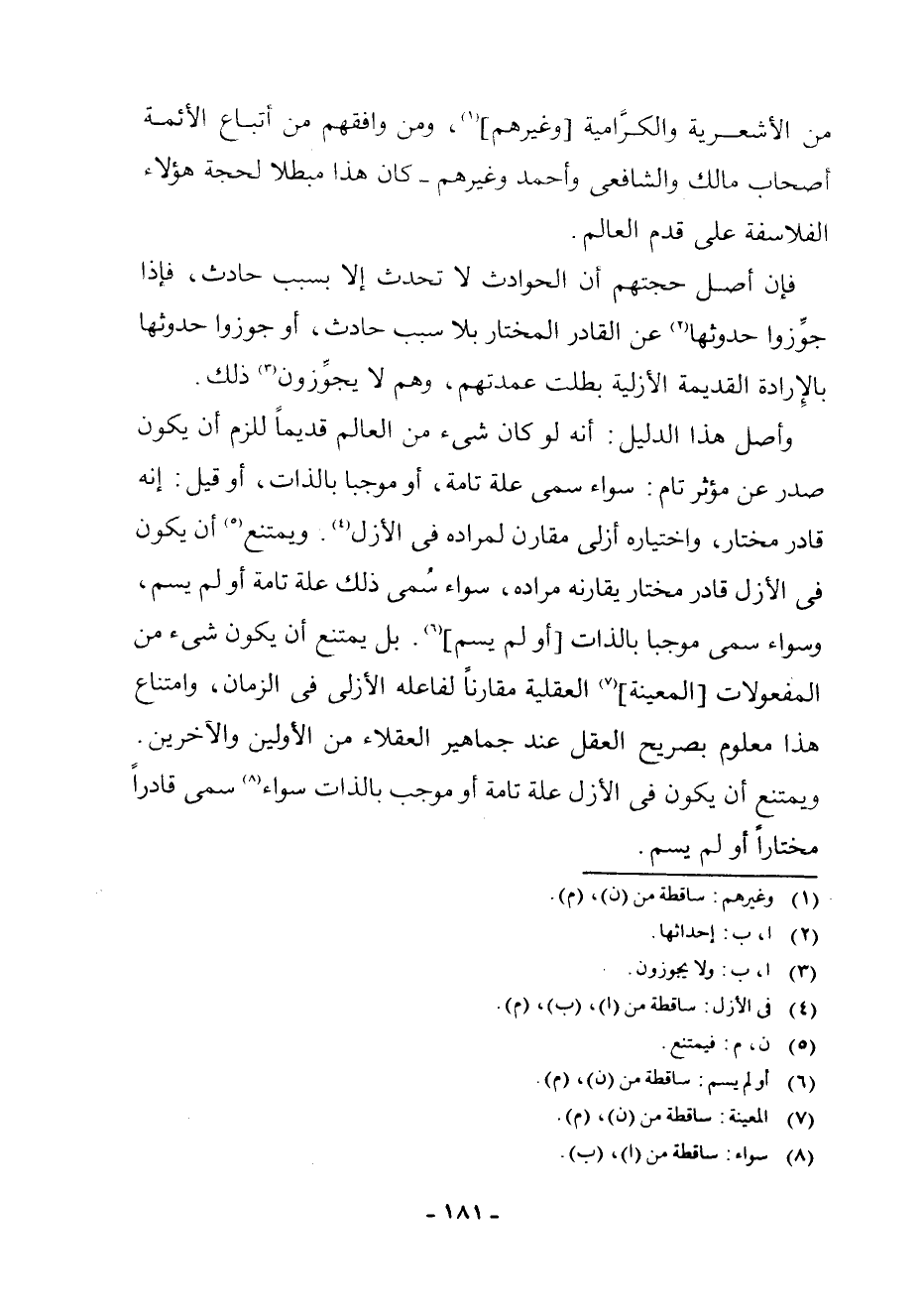 وَأَصْلُ هَذَا الدَّلِيلِ أَنَّهُ لَوْ كَانَ شَيْءٌ مِنَ الْعَالَمِ قَدِيمًا لَلَزِمَ أَنْ يَكُونَ صَدَرَ عَنْ مُؤَثِّرٍ تَامٍّ سَوَاءٌ سُمِّيَ عِلَّةً تَامَّةً، أَوْ مُوجِبًا بِالذَّاتِ، أَوْ قِيلَ: إِنَّهُ قَادِرٌ مُخْتَارٌ، وَاخْتِيَارُهُ أَزَلِيٌّ مُقَارِنٌ لِمُرَادِهِ فِي الْأَزَلِ (¬4) ، وَيَمْتَنِعُ (¬5) أَنْ يَكُونَ فِي الْأَزَلِ، وَيَمْتَنِعُ أَنْ يَكُونَ فِي الْأَزَلِ قَادِرٌ مُخْتَارٌ يُقَارِنُهُ مُرَادُهُ سَوَاءٌ سُمِّيَ ذَلِكَ عِلَّةً تَامَّةً، أَوْ لَمْ يُسَمَّ، وَسَوَاءٌ سُمِّيَ مُوجِبًا بِالذَّاتِ، [أَوْ لَمْ يُسَمَّ] (¬6) ، بَلْ يَمْتَنِعُ أَنْ يَكُونَ شَيْءٌ مِنَ الْمَفْعُولَاتِ [الْمُعَيَّنَةِ] (¬7) الْعَقْلِيَّةِ مُقَارِنًا لِفَاعِلِهِ الْأَزَلِيِّ فِي الزَّمَانِ، وَامْتِنَاعُ هَذَا مَعْلُومٌ بِصَرِيحِ الْعَقْلِ عِنْدَ جَمَاهِيرِ الْعُقَلَاءِ مِنَ الْأَوَّلِينَ وَالْآخِرِينَ، وَيَمْتَنِعُ أَنْ يَكُونَ فِي الْأَزَلِ عِلَّةٌ تَامَّةٌ، أَوْ مُوجِبٌ بِالذَّاتِ سَوَاءٌ (¬8) سُمِّيَ قَادِرًا مُخْتَارًا، أَوْ لَمْ يُسَمَّ.