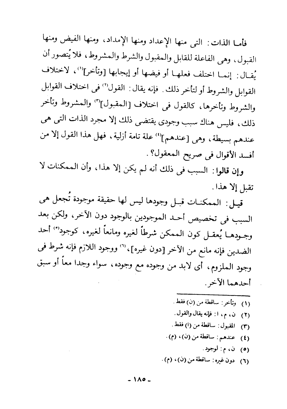 فَأَمَّا الذَّاتُ: الَّتِي مِنْهَا الْإِعْدَادُ، وَمِنْهَا الْإِمْدَادُ، وَمِنْهَا الْفَيْضُ، وَمِنْهَا الْقَبُولُ، وَهِيَ الْفَاعِلَةُ لِلْقَابِلِ وَالْمَقْبُولِ وَالشَّرْطِ وَالْمَشْرُوطِ، فَلَا يُتَصَوَّرُ أَنْ يُقَالَ: إِنَّمَا اخْتُلِفَ فِعْلُهَا أَوْ فَيْضُهَا أَوْ إِيجَابُهَا، [وَتَأَخَّرَ] (¬1) لِاخْتِلَافِ الْقَوَابِلِ وَالشُّرُوطِ، أَوْ لِتَأَخُّرِ ذَلِكَ، فَإِنَّهُ يُقَالُ: الْقَوْلُ (¬2) فِي اخْتِلَافِ الْقَوَابِلِ وَالشُّرُوطِ وَتَأَخُّرِهَا كَالْقَوْلِ فِي اخْتِلَافِ [الْمَقْبُولِ] (¬3) ، وَالْمَشْرُوطِ وَتَأَخُّرِ ذَلِكَ، فَلَيْسَ هُنَاكَ سَبَبٌ وُجُودِيٌّ يَقْتَضِي ذَلِكَ إِلَّا مُجَرَّدُ الذَّاتِ الَّتِي هِيَ عِنْدَهُمْ بَسِيطَةٌ، وَهِيَ [عِنْدَهُمْ] (¬4) عِلَّةٌ تَامَّةٌ أَزَلِيَّةٌ، فَهَلْ هَذَا الْقَوْلُ إِلَّا مِنْ أَفْسَدِ الْأَقْوَالِ فِي صَرِيحِ الْمَعْقُولِ؟ .