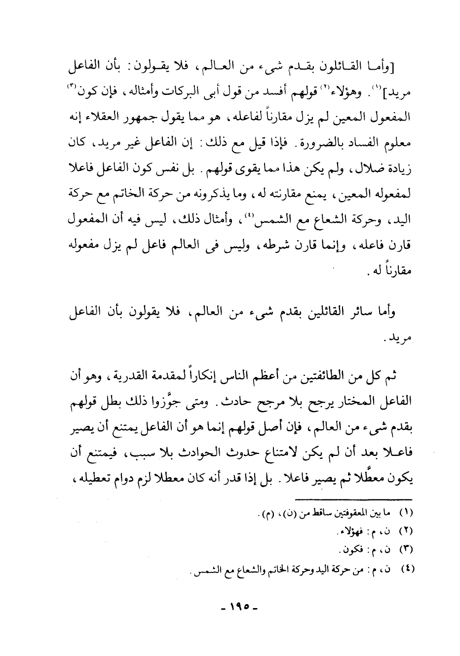 وَأَمَّا سَائِرُ الْقَائِلِينَ بِقِدَمِ شَيْءٍ مِنَ الْعَالَمِ، فَلَا يَقُولُونَ. بِأَنَّ الْفَاعِلَ مُرِيدٌ.
