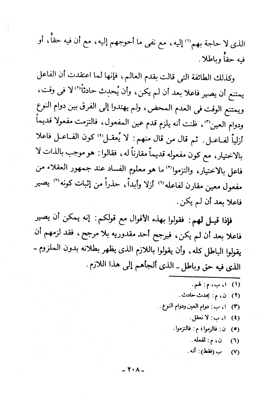 وَكَذَلِكَ الطَّائِفَةُ الَّتِي قَالَتْ بِقِدَمِ الْعَالَمِ، فَإِنَّهَا لَمَّا اعْتَقَدَتْ أَنَّ الْفَاعِلَ يَمْتَنِعُ أَنْ يَصِيرَ فَاعِلًا بَعْدَ أَنْ لَمْ يَكُنْ، وَأَنْ يُحْدِثَ حَادِثًا (¬2) لَا فِي وَقْتٍ، وَيَمْتَنِعَ الْوَقْتُ فِي الْعَدَمِ الْمَحْضِ، وَلَمْ يَهْتَدُوا إِلَى الْفَرْقِ بَيْنَ دَوَامِ النَّوْعِ وَدَوَامِ الْعَيْنِ (¬3) ظَنَّتْ أَنَّهُ يَلْزَمُ قِدَمُ عَيْنِ الْمَفْعُولِ، فَالْتَزَمَتْ مَفْعُولًا قَدِيمًا أَزَلِيًّا لِفَاعِلٍ، ثُمَّ قَالَ: مَنْ قَالَ مِنْهُمْ: لَا يُعْقَلُ (¬4) كَوْنُ الْفَاعِلِ فَاعِلًا بِالِاخْتِيَارِ مَعَ كَوْنِ مَفْعُولِهِ قَدِيمًا مُقَارِنًا لَهُ، فَقَالُوا: هُوَ مُوجِبٌ بِالذَّاتِ لَا فَاعِلٌ بِالِاخْتِيَارِ، وَالْتَزَمُوا (¬5) مَا هُوَ مَعْلُومُ الْفَسَادِ عِنْدَ جُمْهُورِ الْعُقَلَاءِ مِنْ مَفْعُولٍ مُعَيَّنٍ مُقَارَنٍ لِفَاعِلِهِ (¬6) أَزَلًا وَأَبَدًا حَذَرًا مِنْ إِثْبَاتِ كَوْنِهِ (¬7) يَصِيرُ فَاعِلًا بَعْدَ أَنْ لَمْ يَكُنْ.