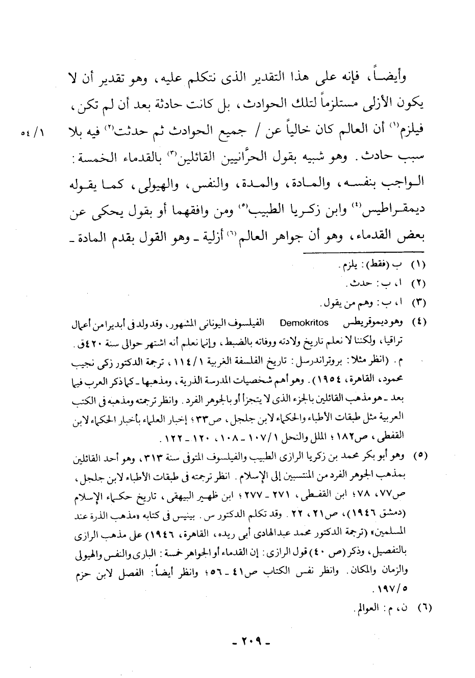 (¬5) وَهُوَ أَبُو بَكْرٍ مُحَمَّدُ بْنُ زَكَرِيَّا الرَّازِيُّ الطَّبِيبُ وَالْفَيْلَسُوفُ الْمُتَوَفَّى سَنَةَ 313، وَهُوَ أَحَدُ الْقَائِلِينَ بِمَذْهَبِ الْجَوْهَرِ الْفَرْدِ مِنَ الْمُنْتَسِبِينَ إِلَى الْإِسْلَامِ. انْظُرْ تَرْجَمَتَهُ فِي طَبَقَاتِ الْأَطِبَّاءِ لِابْنِ جَلْجَلَ، ص 77، 78 ; ابْنُ الْقِفْطِيِّ، 271 - 277 ; ابْنُ ظَهِيرٍ الْبَيْهَقِيُّ، تَارِيخَ حُكَمَاءِ الْإِسْلَامِ (دِمَشْقَ 1946) ، ص [0 - 9] 1، 22. وَقَدْ تَكَلَّمَ الدُّكْتُورُ س. بِينِيسُ فِي كِتَابِهِ " مَذْهَبِ الذَّرَّةِ عِنْدَ الْمُسْلِمِينَ " (تَرْجَمَةَ الدُّكْتُورِ مُحَمَّدِ عَبْدِ الْهَادِي أَبِي رَيْدَهْ، الْقَاهِرَةِ، 1946) عَلَى مَذْهَبِ الرَّازِيِّ بِالتَّفْصِيلِ، وَذَكَرَ (ص [0 - 9] 0) قَوْلَ الرَّازِيِّ: إِنَّ الْقُدَمَاءَ أَوِ الْجَوَاهِرَ خَمْسَةٌ: الْبَارِيُّ وَالنَّفْسُ وَالْهَيُولَى وَالزَّمَانُ وَالْمَكَانُ. وَانْظُرْ نَفْسَ الْكِتَابِ ص [0 - 9] 1 - 56 ; انْظُرْ أَيْضًا: الْفِصَلَ لِابْنِ حَزْمٍ 5 - 197.