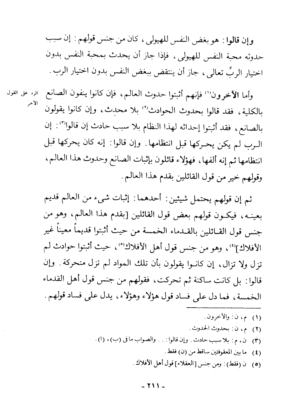 وَأَمَّا الْآخَرُونَ (¬1) فَإِنَّهُمْ أَثْبَتُوا حُدُوثَ الْعَالَمِ، فَإِنْ كَانُوا يَنْفُونَ الصَّانِعَ بِالْكُلِّيَّةِ، فَقَدْ قَالُوا بِحُدُوثِ الْحَوَادِثِ (¬2) بِلَا مُحْدَثٍ، وَإِنْ كَانُوا يَقُولُونَ بِالصَّانِعِ، فَقَدْ أَثْبَتُوا إِحْدَاثَهُ لِهَذَا النِّظَامِ بِلَا سَبَبٍ حَادِثٍ إِنْ قَالُوا (¬3) : إِنَّ الرَّبَّ لَمْ يَكُنْ يُحَرِّكُهَا قَبْلَ انْتِظَامِهَا، وَإِنْ قَالُوا: إِنَّهُ كَانَ يُحَرِّكُهَا قَبْلَ انْتِظَامِهَا، ثُمَّ إِنَّهُ أَلَّفَهَا، فَهَؤُلَاءِ قَائِلُونَ بِإِثْبَاتِ الصَّانِعِ وَحُدُوثِ هَذَا الْعَالَمِ، وَقَوْلِهِمْ خَيْرٌ مِنْ قَوْلِ الْقَائِلِينَ بِقِدَمِ هَذَا الْعَالَمِ.