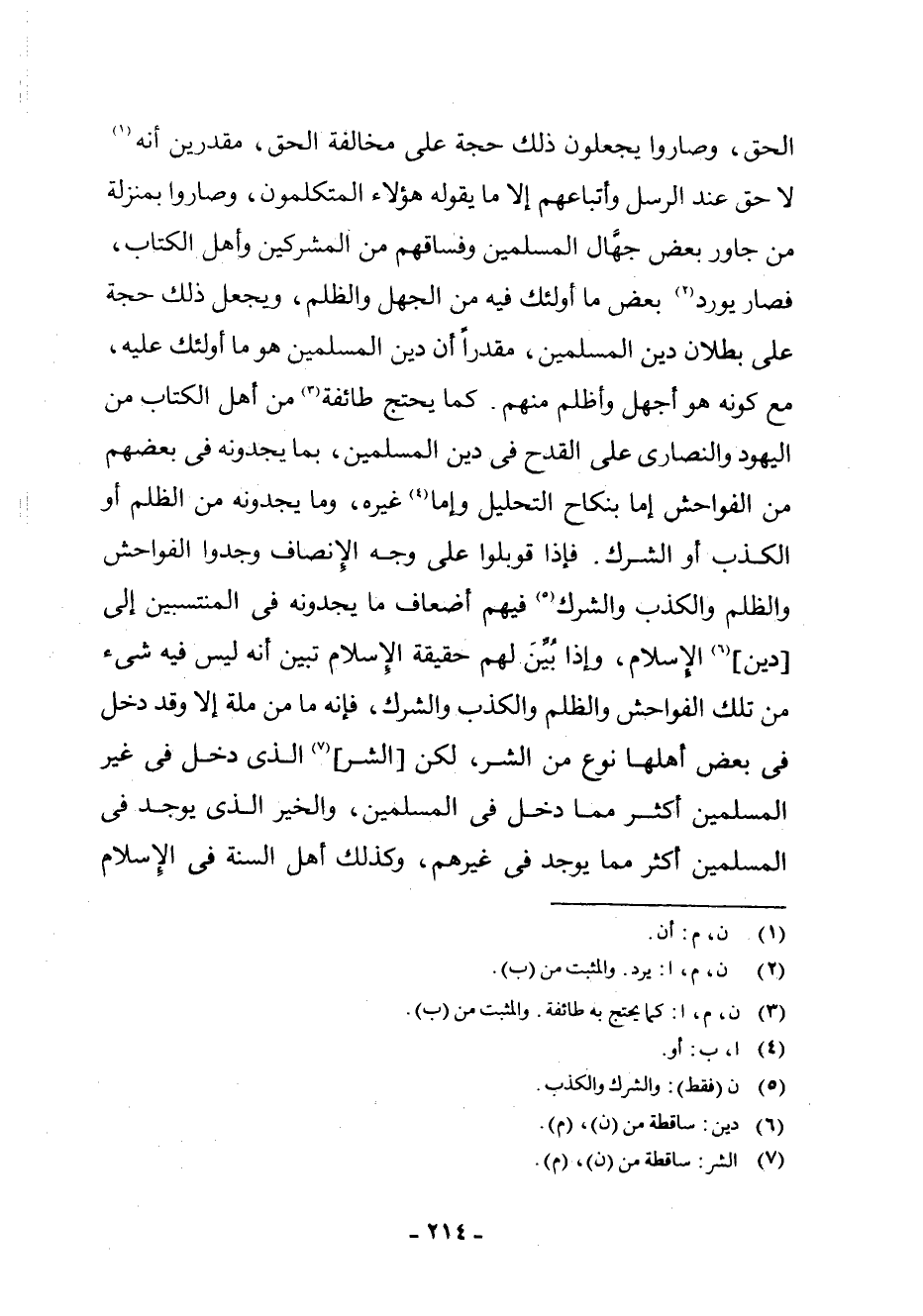 الْحَقَّ، وَصَارُوا يَجْعَلُونَ ذَلِكَ حُجَّةً عَلَى مُخَالَفَةِ الْحَقِّ مُقَدِّرِينَ أَنَّهُ (¬1) لَا حَقَّ عِنْدَ الرُّسُلِ وَأَتْبَاعِهِمْ إِلَّا مَا يَقُولُهُ هَؤُلَاءِ الْمُتَكَلِّمُونَ، وَصَارُوا بِمَنْزِلَةِ مَنْ جَاوَرَ بَعْضَ جُهَّالِ الْمُسْلِمِينَ وَفُسَّاقِهِمْ مِنَ الْمُشْرِكِينَ وَأَهْلِ الْكِتَابِ، فَصَارَ يُورِدُ (¬2) بَعْضَ مَا أُولَئِكَ فِيهِ مِنَ الْجَهْلِ وَالظُّلْمِ، وَيَجْعَلُ ذَلِكَ حُجَّةً عَلَى بُطْلَانِ دِينِ الْمُسْلِمِينَ مُقَدِّرًا أَنَّ دِينَ الْمُسْلِمِينَ هُوَ مَا أُولَئِكَ عَلَيْهِ مَعَ كَوْنِهِ هُوَ أَجْهَلُ، وَأَظْلَمُ مِنْهُمْ، كَمَا يَحْتَجُّ طَائِفَةٌ (¬3) مِنْ أَهْلِ الْكِتَابِ مِنَ الْيَهُودِ وَالنَّصَارَى عَلَى الْقَدْحِ فِي دِينِ الْمُسْلِمِينَ بِمَا يَجِدُونَ فِي بَعْضِهِمْ مِنَ الْفَوَاحِشِ إِمَّا بِنِكَاحِ التَّحْلِيلِ، وَإِمَّا (¬4) غَيْرِهِ، وَمَا يَجِدُونَهُ مِنَ الظُّلْمِ، أَوِ الْكَذِبِ، أَوِ الشِّرْكِ، فَإِذَا قُوبِلُوا عَلَى وَجْهِ الْإِنْصَافِ وَجَدُوا الْفَوَاحِشَ وَالظُّلْمَ وَالْكَذِبَ وَالشِّرْكَ (¬5) فِيهِمْ أَضْعَافَ مَا يَجِدُونَهُ فِي الْمُنْتَسِبِينَ إِلَى [دِينِ] (¬6) الْإِسْلَامِ، وَإِذَا بُيِّنَ لَهُمْ حَقِيقَةُ الْإِسْلَامِ تَبَيَّنَ أَنَّهُ لَيْسَ فِيهِ شَيْءٌ مِنْ تِلْكَ الْفَوَاحِشِ، وَالظُّلْمِ، وَالْكَذِبِ، وَالشِّرْكِ، فَإِنَّهُ مَا مِنْ مِلَّةٍ إِلَّا وَقَدْ دَخَلَ فِي بَعْضِ أَهْلِهَا نَوْعٌ مِنَ الشَّرِّ لَكِنَّ [الشَّرَّ] (¬7) الَّذِي دَخَلَ فِي غَيْرِ الْمُسْلِمِينَ أَكْثَرُ مِمَّا دَخَلَ فِي الْمُسْلِمِينَ وَالْخَيْرَ الَّذِي يُوجَدُ فِي الْمُسْلِمِينَ أَكْثَرُ مِمَّا يُوجَدُ فِي غَيْرِهِمْ، وَكَذَلِكَ أَهْلُ السُّنَّةِ فِي الْإِسْلَامِ