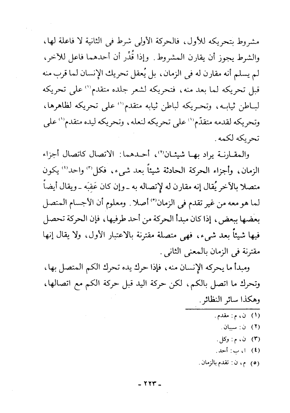 وَمَبْدَأُ مَا يُحَرِّكُهُ الْإِنْسَانُ مِنْهُ، فَإِذَا حَرَّكَ يَدَهُ تَحَرَّكَ الْكُمُّ الْمُتَّصِلُ بِهَا، وَتَحَرَّكَ مَا اتَّصَلَ بِالْكُمِّ لَكِنَّ حَرَكَةَ الْيَدِ قَبْلَ حَرَكَةِ الْكُمِّ مَعَ اتِّصَالِهَا، وَهَكَذَا سَائِرُ النَّظَائِرِ.