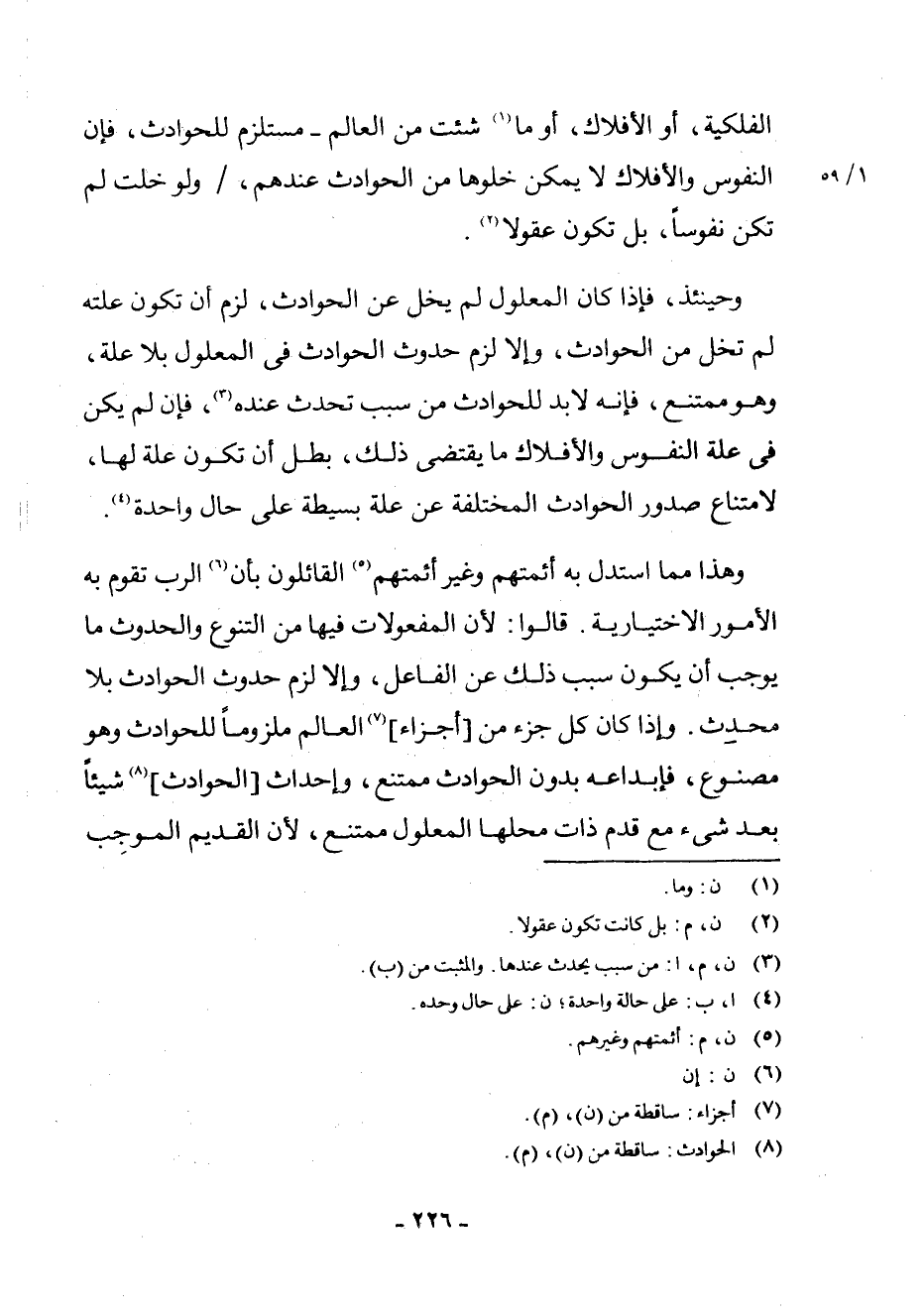 وَحِينَئِذٍ فَإِذَا كَانَ الْمَعْلُولُ لَمْ يَخْلُ عَنِ الْحَوَادِثِ لَزِمَ أَنْ تَكُونَ عِلَّتُهُ لَمْ تَخْلُ مِنَ الْحَوَادِثِ، وَإِلَّا لَزِمَ حُدُوثُ الْحَوَادِثِ فِي الْمَعْلُولِ بِلَا عِلَّةٍ، وَهُوَ مُمْتَنِعٌ، فَإِنَّهُ لَا بُدَّ لِلْحَوَادِثِ مِنْ سَبَبٍ تَحْدُثُ عِنْدَهُ (¬3) ، فَإِنْ لَمْ يَكُنْ فِي عِلَّةِ النُّفُوسِ وَالْأَفْلَاكِ مَا يَقْتَضِي ذَلِكَ بَطَلَ أَنْ تَكُونَ عِلَّةً لَهَا لِامْتِنَاعِ صُدُورِ الْحَوَادِثِ الْمُخْتَلِفَةِ عَنْ عِلَّةٍ بَسِيطَةٍ عَلَى حَالٍ وَاحِدَةٍ (¬4) .