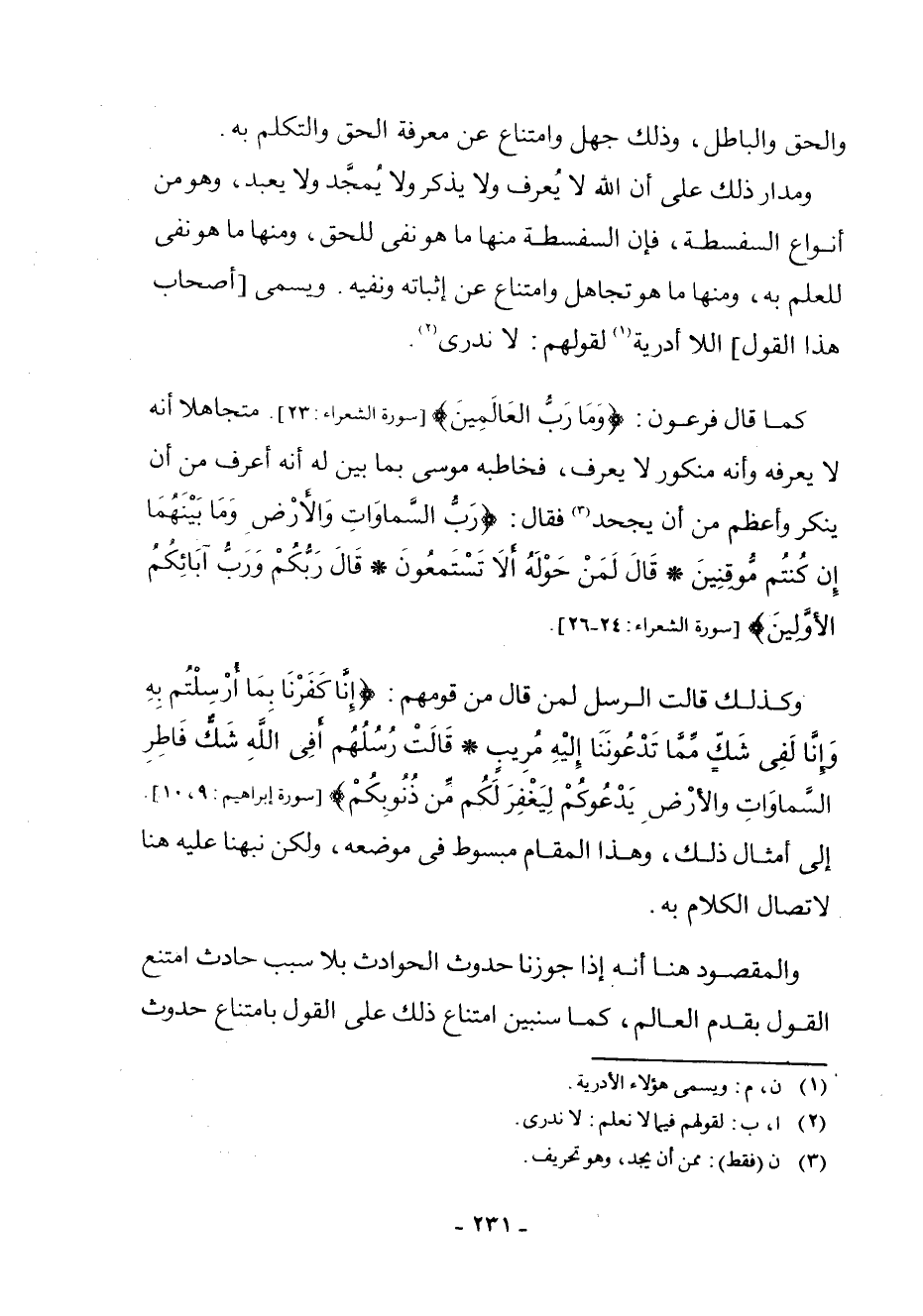 وَمَدَارُ ذَلِكَ عَلَى أَنَّ اللَّهَ لَا يُعْرَفُ وَلَا يُذْكَرُ وَلَا يُمَجَّدُ وَلَا يُعْبَدُ، وَهُوَ مِنْ أَنْوَاعِ السَّفْسَطَةِ، فَإِنَّ السَّفْسَطَةَ مِنْهَا مَا هُوَ نَفْيٌ لِلْحَقِّ، وَمِنْهَا مَا هُوَ نَفْيٌ لِلْعِلْمِ بِهِ، وَمِنْهَا مَا هُوَ تَجَاهُلٌ، وَامْتِنَاعٌ عَنْ إِثْبَاتِهِ، وَنَفْيِهِ، وَيُسَمَّى [أَصْحَابُ هَذَا الْقَوْلِ] الْلَا أَدْرِيَّةَ (¬1) لِقَوْلِهِمْ: لَا نَدْرِي (¬2) .