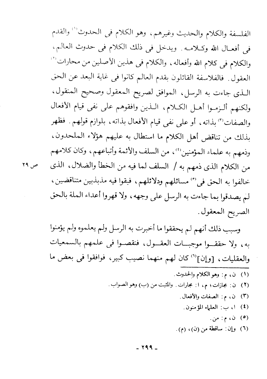 الْفَلْسَفَةِ، وَالْكَلَامِ، وَالْحَدِيثِ، وَغَيْرِهِمْ، وَهُوَ الْكَلَامُ فِي الْحُدُوثِ (¬1) وَالْقِدَمِ فِي أَفْعَالِ اللَّهِ وَكَلَامِهِ، وَيَدْخُلُ فِي ذَلِكَ الْكَلَامُ فِي حُدُوثِ الْعَالَمِ وَالْكَلَامُ فِي كَلَامِ اللَّهِ وَأَفْعَالِهِ، وَالْكَلَامُ فِي هَذَيْنِ الْأَصْلَيْنِ مِنْ مَحَارَاتِ (¬2) الْعُقُولِ، فَالْفَلَاسِفَةُ الْقَائِلُونَ بِقِدَمِ الْعَالَمِ كَانُوا فِي غَايَةِ الْبُعْدِ عَنِ الْحَقِّ الَّذِي جَاءَتْ بِهِ الرُّسُلُ الْمُوَافِقِ لِصَرِيحِ الْمَعْقُولِ وَصَحِيحِ الْمَنْقُولِ، وَلَكِنَّهُمْ أَلْزَمُوا أَهْلَ الْكَلَامِ الَّذِينَ وَافَقُوهُمْ عَلَى نَفْيِ قِيَامِ الْأَفْعَالِ وَالصِّفَاتِ (¬3) بِذَاتِهِ، أَوْ عَلَى نَفْيِ قِيَامِ الْأَفْعَالِ بِذَاتِهِ بِلَوَازِمِ قَوْلِهِمْ، فَظَهَرَ بِذَلِكَ مِنْ تَنَاقُضِ أَهْلِ الْكَلَامِ مَا اسْتَطَالَ بِهِ عَلَيْهِمْ هَؤُلَاءِ الْمُلْحِدُونَ، وَذَمَّهُمْ بِهِ عُلَمَاءُ الْمُؤْمِنِينَ (¬4) مِنَ السَّلَفِ وَالْأَئِمَّةِ وَأَتْبَاعِهِمْ، وَكَانَ كَلَامُهُمْ مِنَ الْكَلَامِ الَّذِي ذَمَّهُمْ بِهِ السَّلَفُ لِمَا فِيهِ مِنَ الْخَطَأِ وَالضَّلَالِ الَّذِي خَالَفُوا بِهِ الْحَقَّ فِي (¬5) مَسَائِلِهِمْ وَدَلَائِلِهِمْ، فَبَقُوا فِيهِ مُذَبْذَبِينَ مُتَنَاقِضِينَ لَمْ يُصَدِّقُوا بِمَا جَاءَتْ بِهِ الرُّسُلُ عَلَى وَجْهِهِ وَلَا قَهَرُوا أَعْدَاءَ الْمِلَّةِ بِالْحَقِّ الصَّرِيحِ الْمَعْقُولِ.