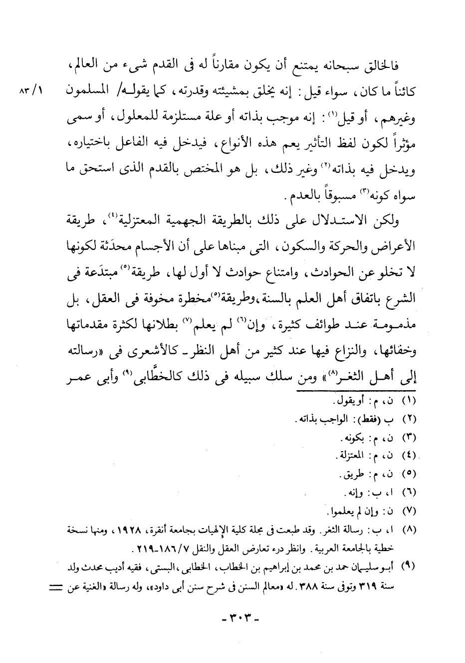 (¬9) ا، ب: رِسَالَةُ الثَّغْرِ. وَقَدْ طُبِعَتْ فِي مَجَلَّةِ كُلِّيَّةِ الْإِلَهِيَّاتِ بِجَامِعَةِ أَنْقَرَةَ، 1928، وَمِنْهَا نُسْخَةٌ خَطِّيَّةٌ بِالْجَامِعَةِ الْعَرَبِيَّةِ، وَانْظُرْ دَرْءَ تَعَارُضِ الْعَقْلِ وَالنَّقْلِ 7/186 - 219.