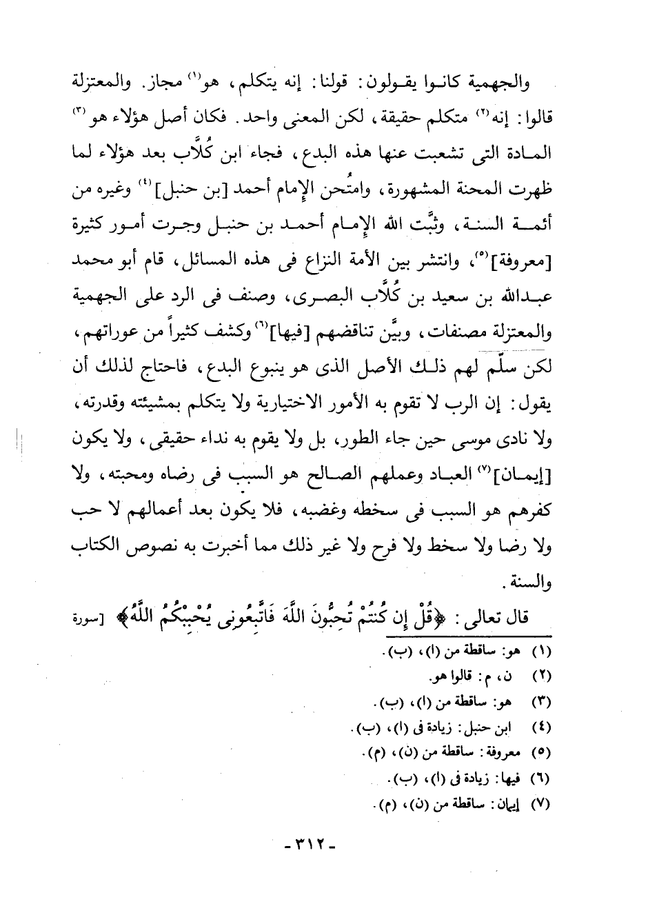 وَالْجَهْمِيَّةُ كَانُوا يَقُولُونَ: قَوْلُنَا: إِنَّهُ يَتَكَلَّمُ هُوَ (¬1) مَجَازٌ. وَالْمُعْتَزِلَةُ قَالُوا: إِنَّهُ (¬2) مُتَكَلِّمٌ حَقِيقَةً، لَكِنَّ الْمَعْنَى وَاحِدٌ. فَكَانَ أَصْلُ هَؤُلَاءِ هُوَ (¬3) الْمَادَّةُ الَّتِي تَشَعَّبَتْ عَنْهَا هَذِهِ الْبِدَعُ، فَجَاءَ ابْنُ كُلَّابٍ بَعْدَ هَؤُلَاءِ لَمَّا ظَهَرَتِ الْمِحْنَةُ الْمَشْهُورَةُ، وَامْتُحِنَ الْإِمَامُ أَحْمَدُ [بْنُ حَنْبَلٍ] (¬4) وَغَيْرُهُ مِنْ أَئِمَّةِ السُّنَّةِ، وَثَبَّتَ اللَّهُ الْإِمَامَ أَحْمَدَ بْنَ حَنْبَلٍ، وَجَرَتْ أُمُورٌ كَثِيرَةٌ [مَعْرُوفَةٌ] (¬5) ، وَانْتَشَرَ بَيْنَ الْأُمَّةِ النِّزَاعُ فِي هَذِهِ الْمَسَائِلِ، قَامَ أَبُو مُحَمَّدٍ عَبْدُ اللَّهِ بْنُ سَعِيدِ بْنِ كُلَّابٍ الْبَصْرِيُّ، وَصَنَّفَ فِي الرَّدِّ عَلَى الْجَهْمِيَّةِ وَالْمُعْتَزِلَةِ مُصَنَّفَاتٍ، وَبَيَّنَ تَنَاقُضَهُمْ [فِيهَا] (¬6) ، وَكَشَفَ كَثِيرًا مِنْ عَوْرَاتِهِمْ، لَكِنْ سَلَّمَ لَهُمْ ذَلِكَ الْأَصْلَ الَّذِي هُوَ يَنْبُوعُ الْبِدَعِ، فَاحْتَاجَ لِذَلِكَ أَنْ يَقُولَ: إِنَّ الرَّبَّ لَا تَقُومُ بِهِ الْأُمُورُ الِاخْتِيَارِيَّةُ، وَلَا يَتَكَلَّمُ بِمَشِيئَتِهِ وَقُدْرَتِهِ، وَلَا نَادَى مُوسَى حِينَ جَاءَ الطُّورَ، بَلْ وَلَا يَقُومُ بِهِ نِدَاءٌ حَقِيقِيٌّ، وَلَا يَكُونُ [إِيمَانُ] (¬7) الْعِبَادِ وَعَمَلُهُمُ الصَّالِحُ هُوَ السَّبَبُ فِي رِضَاهُ وَمَحَبَّتِهِ، وَلَا كُفْرِهِمْ هُوَ السَّبَبُ فِي سُخْطِهِ وَغَضَبِهِ، فَلَا يَكُونُ بَعْدَ أَعْمَالِهِمْ لَا حُبَّ وَلَا رِضَا وَلَا سُخْطَ وَلَا فَرَحَ وَلَا غَيْرَ ذَلِكَ مِمَّا أَخْبَرَتْ بِهِ نُصُوصُ الْكِتَابِ وَالسُّنَّةِ.