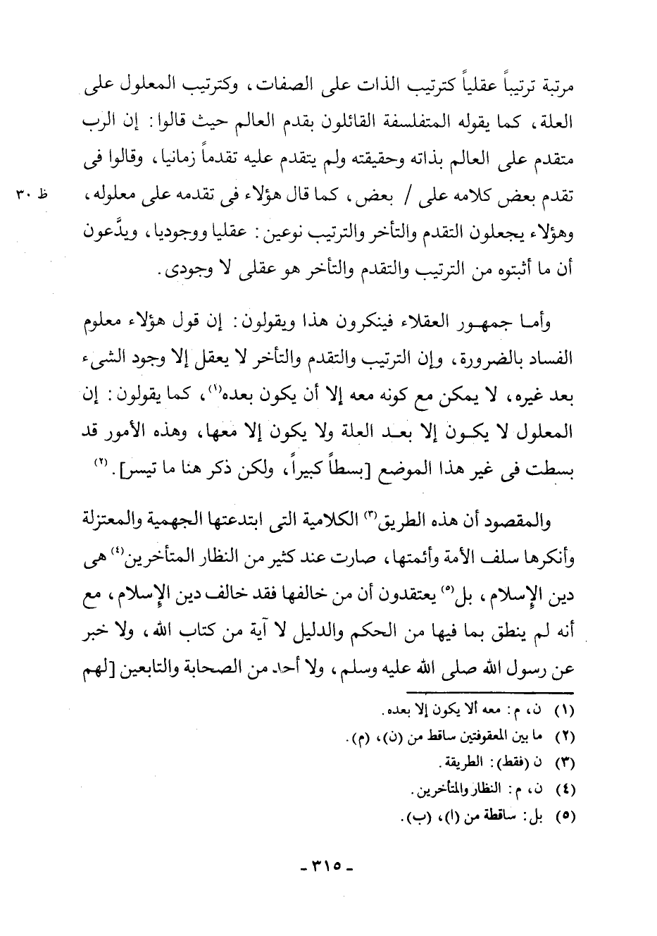 مُرَتَّبَةً تَرْتِيبًا عَقْلِيًّا كَتَرْتِيبِ الذَّاتِ عَلَى الصِّفَاتِ، وَكَتَرْتِيبِ الْمَعْلُولِ عَلَى الْعِلَّةِ كَمَا يَقُولُهُ الْمُتَفَلْسِفَةُ الْقَائِلُونَ بِقِدَمِ الْعَالَمِ حَيْثُ قَالُوا: إِنَّ الرَّبَّ مُتَقَدِّمٌ عَلَى الْعَالَمِ بِذَاتِهِ وَحَقِيقَتِهِ وَلَمْ يَتَقَدَّمْ عَلَيْهِ تَقَدُّمًا زَمَانِيًّا، وَقَالُوا فِي تَقَدُّمِ بَعْضِ كَلَامِهِ عَلَى بَعْضٍ كَمَا قَالَ هَؤُلَاءِ فِي تَقَدُّمِهِ عَلَى مَعْلُولِهِ، وَهَؤُلَاءِ يَجْعَلُونَ التَّقَدُّمَ وَالتَّأَخُّرَ وَالتَّرْتِيبَ نَوْعَيْنِ: عَقْلِيًّا وَوُجُودِيًّا، وَيَدَّعُونَ أَنَّ مَا أَثْبَتُوهُ مِنَ التَّرْتِيبِ وَالتَّقَدُّمِ وَالتَّأَخُّرِ هُوَ عَقْلِيٌّ لَا وُجُودِيٌّ.