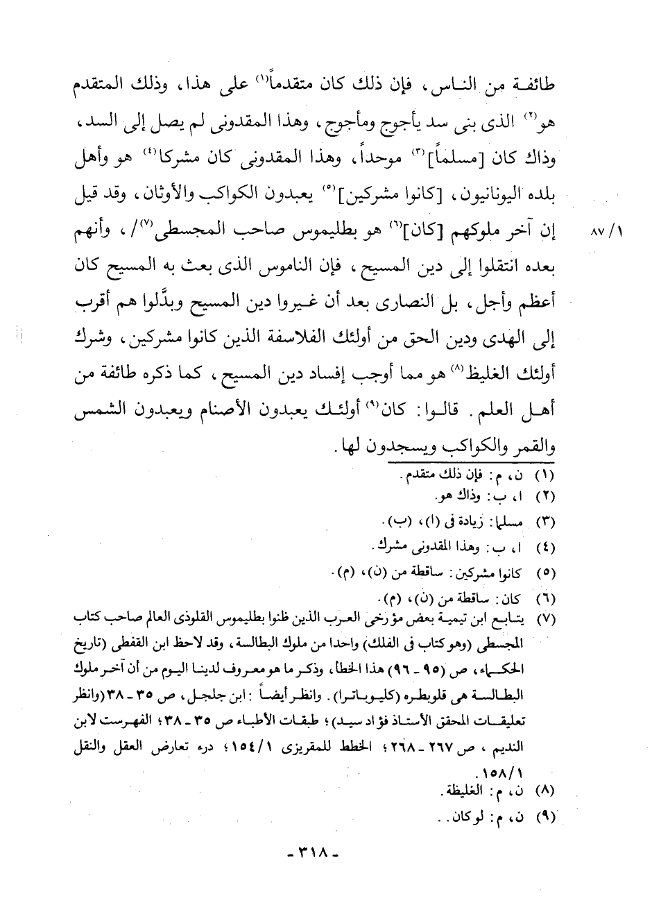 (¬7) يُتَابِعُ ابْنَ تَيْمِيَةَ بَعْضُ مُؤَرِّخِي الْعَرَبِ الَّذِينَ ظَنُّوا بَطْلَيْمُوسَ الْقَلْوَذِيَّ الْعَالِمَ صَاحِبَ كِتَابِ الْمِجِسْطَى (وَهُوَ كِتَابٌ فِي الْفَلَكِ) وَاحِدًا مِنْ مُلُوكِ الْبَطَالِسَةِ، وَقَدْ لَاحَظَ ابْنُ الْقِفْطِيِّ (تَارِيخَ الْحُكَمَاءِ، ص (95 - 96) هَذَا الْخَطَأَ، وَذَكَرَ مَا هُوَ مَعْرُوفٌ لَدَيْنَا الْيَوْمَ مِنْ أَنَّ آخِرَ مُلُوكِ الْبَطَالِسَةِ هِيَ قِلُوبَطْرَةُ (كِلْيُوبَاتْرَا) . وَانْظُرْ أَيْضًا: ابْنَ جُلْجُلٍ، ص 35 - 38 (انْظُرْ تَعْلِيقَاتِ الْمُحَقِّقِ الْأُسْتَاذِ فُؤَادْ سَيِّدْ) ؛ طَبَقَاتِ الْأَطِبَّاءِ ص 35 - 38؛ الْفِهْرِسْتَ لِابْنِ النَّدِيمِ، ص [0 - 9] 67 - 268؛ الْخُطَطَ لِلْمَقْرِيزِيِّ 1/154؛ دَرْءَ تَعَارُضِ الْعَقْلِ وَالنَّقْلِ 1/158.