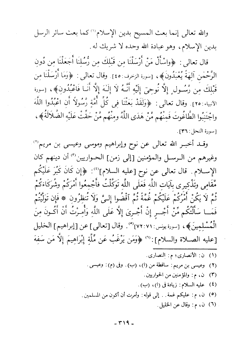 وَاللَّهُ تَعَالَى إِنَّمَا بَعَثَ الْمَسِيحَ بِدِينِ الْإِسْلَامِ (¬1) كَمَا بَعَثَ سَائِرَ الرُّسُلِ بِدِينِ الْإِسْلَامِ، وَهُوَ عِبَادَةُ اللَّهِ وَحْدَهُ لَا شَرِيكَ لَهُ.