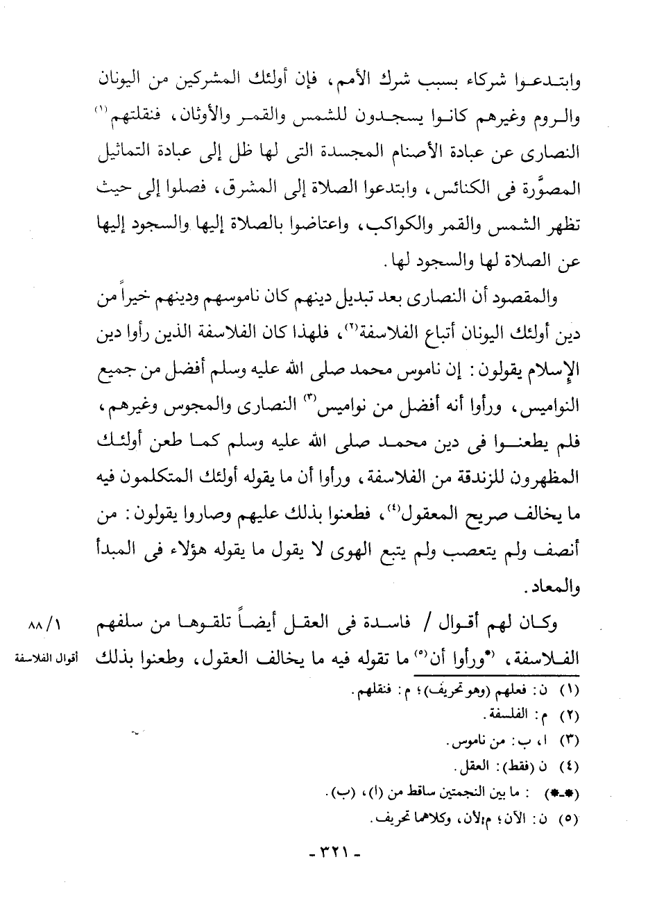 وَالْمَقْصُودُ أَنَّ النَّصَارَى بَعْدَ تَبْدِيلِ دِينِهِمْ كَانَ نَامُوسُهُمْ وَدِينُهُمْ خَيْرًا مِنْ دِينِ أُولَئِكَ الْيُونَانِ أَتْبَاعِ الْفَلَاسِفَةِ (¬2) ، فَلِهَذَا كَانَ الْفَلَاسِفَةُ الَّذِينَ رَأَوْا دِينَ الْإِسْلَامِ يَقُولُونَ: إِنَّ نَامُوسَ مُحَمَّدٍ - صَلَّى اللَّهُ عَلَيْهِ وَسَلَّمَ - أَفْضَلُ مِنْ جَمِيعِ النَّوَامِيسِ، وَرَأَوْا أَنَّهُ أَفْضَلُ مِنْ نَوَامِيسِ (¬3) النَّصَارَى وَالْمَجُوسِ وَغَيْرِهِمْ، فَلَمْ يَطْعَنُوا فِي دِينِ مُحَمَّدٍ - صَلَّى اللَّهُ عَلَيْهِ وَسَلَّمَ - كَمَا طَعَنَ أُولَئِكَ الْمُظْهِرُونَ لِلزَّنْدَقَةِ مِنَ الْفَلَاسِفَةِ، وَرَأَوْا أَنَّ مَا يَقُولُهُ أُولَئِكَ الْمُتَكَلِّمُونَ فِيهِ مَا يُخَالِفُ صَرِيحَ الْمَعْقُولِ (¬4) ، فَطَعَنُوا بِذَلِكَ عَلَيْهِمْ، وَصَارُوا يَقُولُونَ: مَنْ أَنْصَفَ وَلَمْ يَتَعَصَّبْ وَلَمْ يَتَّبِعِ الْهَوَى لَا يَقُولُ مَا يَقُولُهُ هَؤُلَاءِ فِي الْمَبْدَأِ وَالْمَعَادِ.