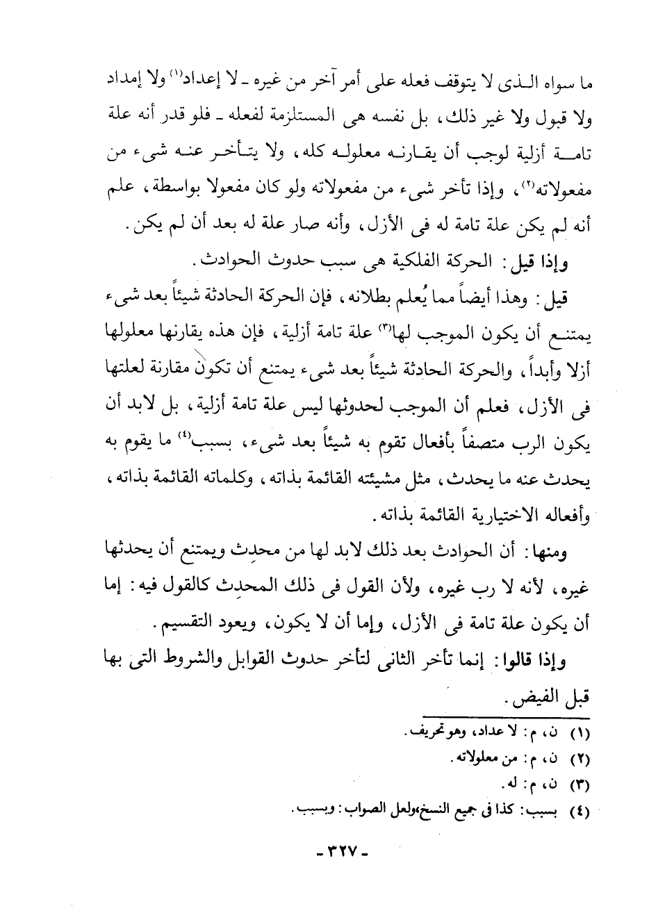 مَا سِوَاهُ الَّذِي لَا يَتَوَقَّفُ فِعْلُهُ عَلَى أَمْرٍ آخَرَ مِنْ غَيْرِهِ - لَا إِعْدَادَ (¬1) وَلَا إِمْدَادَ وَلَا قَبُولَ وَلَا غَيْرَ ذَلِكَ، بَلْ نَفْسُهُ هِيَ الْمُسْتَلْزِمَةُ لِفِعْلِهِ - فَلَوْ قُدِّرَ أَنَّهُ عِلَّةٌ تَامَّةٌ أَزَلِيَّةٌ لَوَجَبَ أَنْ يُقَارِنَهُ مَعْلُولُهُ كُلُّهُ، وَلَا يَتَأَخَّرَ عَنْهُ شَيْءٌ مِنْ مَفْعُولَاتِهِ (¬2) ، وَإِذَا تَأَخَّرَ شَيْءٌ مِنْ مَفْعُولَاتِهِ وَلَوْ كَانَ مَفْعُولًا بِوَاسِطَةٍ، عُلِمَ أَنَّهُ لَمْ يَكُنْ عِلَّةٌ تَامَّةٌ لَهُ فِي الْأَزَلِ، وَأَنَّهُ صَارَ عِلَّةً بَعْدَ أَنْ لَمْ يَكُنْ