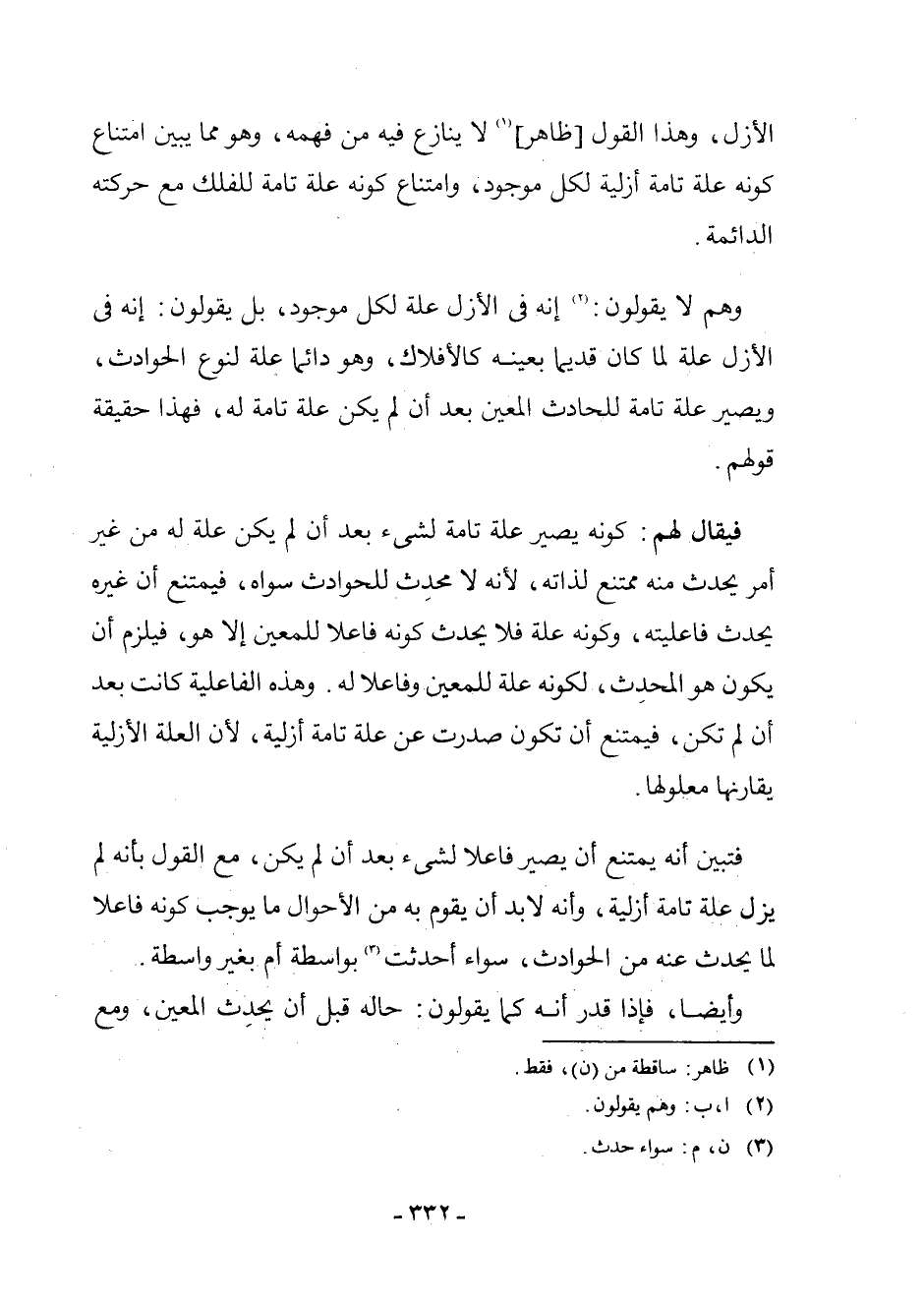 وَهُمْ لَا يَقُولُونَ: (¬2) إِنَّهُ فِي الْأَزَلِ عِلَّةٌ لِكُلِّ مَوْجُودٍ، بَلْ يَقُولُونَ: إِنَّهُ فِي الْأَزَلِ عِلَّةٌ لِمَا كَانَ قَدِيمًا بِعَيْنِهِ كَالْأَفْلَاكِ، وَهُوَ دَائِمًا عِلَّةٌ لِنَوْعِ الْحَوَادِثِ، وَيَصِيرُ عِلَّةً تَامَّةً لِلْحَادِثِ الْمُعَيَّنِ بَعْدَ أَنْ لَمْ يَكُنْ عِلَّةً تَامَّةً لَهُ، فَهَذَا حَقِيقَةُ قَوْلِهِمْ.