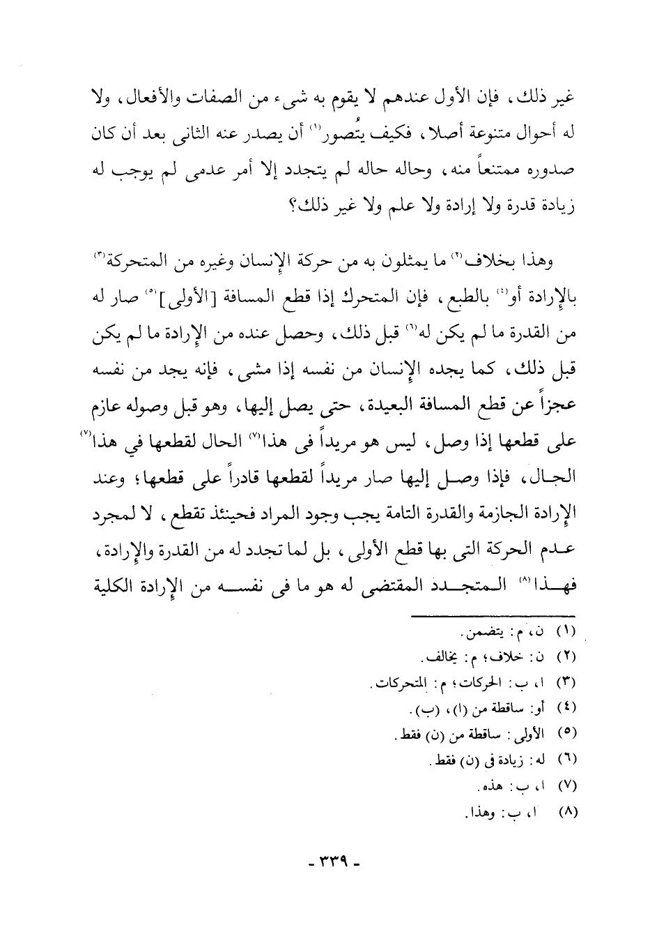 وَهَذَا بِخِلَافِ (¬2) مَا يُمَثِّلُونَ بِهِ مِنْ حَرَكَةِ الْإِنْسَانِ وَغَيْرِهِ مِنَ الْمُتَحَرِّكَةِ (¬3) بِالْإِرَادَةِ أَوْ (¬4) بِالطَّبْعِ، فَإِنَّ الْمُتَحَرِّكَ إِذَا قَطَعَ الْمَسَافَةَ [الْأُولَى] (¬5) صَارَ لَهُ مِنَ الْقُدْرَةِ مَا لَمْ يَكُنْ لَهُ (¬6) قَبْلَ ذَلِكَ، وَحَصَلَ عِنْدَهُ مِنَ الْإِرَادَةِ مَا لَمْ يَكُنْ قَبْلَ ذَلِكَ، كَمَا يَجِدُهُ الْإِنْسَانُ مِنْ نَفْسِهِ إِذَا مَشَى، فَإِنَّهُ يَجِدُ مِنْ نَفْسِهِ عَجْزًا عَنْ قَطْعِ الْمَسَافَةِ الْبَعِيدَةِ حَتَّى يَصِلَ إِلَيْهَا، وَهُوَ قَبْلَ وُصُولِهِ عَازِمٌ عَلَى قَطْعِهَا، إِذَا وَصَلَ لَيْسَ هُوَ مُرِيدًا فِي هَذَا (¬7) الْحَالِ لِقَطْعِهَا فِي هَذَا (¬8) الْحَالِ، فَإِذَا وَصَلَ إِلَيْهَا صَارَ مُرِيدًا لِقَطْعِهَا قَادِرًا عَلَى قَطْعِهَا، وَعِنْدَ الْإِرَادَةِ الْجَازِمَةِ وَالْقُدْرَةِ التَّامَّةِ يَجِبُ وُجُودُ الْمُرَادِ، فَحِينَئِذٍ تُقْطَعُ لَا لِمُجَرَّدِ عَدَمِ الْحَرَكَةِ الَّتِي بِهَا قَطْعُ الْأُولَى بَلْ لِمَا تَجَدَّدَ لَهُ مِنَ الْقُدْرَةِ وَالْإِرَادَةِ، فَهَذَا (¬9) الْمُتَجَدِّدُ الْمُقْتَضِي لَهُ هُوَ مَا فِي نَفْسِهِ مِنَ الْإِرَادَةِ الْكُلِّيَّةِ