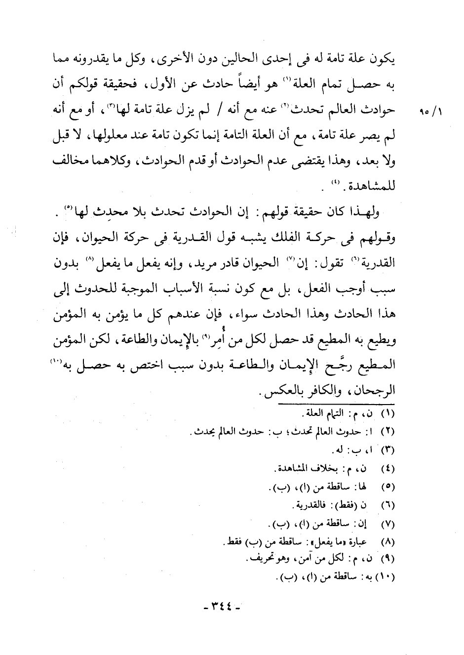 يَكُونُ عِلَّةً تَامَّةً لَهُ فِي إِحْدَى الْحَالَيْنِ دُونَ الْأُخْرَى، وَكُلُّ مَا يُقَدِّرُونَهُ مِمَّا حَصَلَ تَمَامُ الْعِلَّةِ (¬1) هُوَ أَيْضًا حَادِثٌ عَنِ الْأَوَّلِ، فَحَقِيقَةُ قَوْلِكُمْ أَنَّ حَوَادِثَ الْعَالَمِ تَحْدُثُ (¬2) ، عَنْهُ مَعَ أَنَّهُ لَمْ يَزَلْ عِلَّةً تَامَّةً لَهَا (¬3) ، أَوْ مَعَ أَنَّهُ لَمْ يَصِرْ عِلَّةً تَامَّةً، مَعَ أَنَّ الْعِلَّةَ التَّامَّةَ إِنَّمَا تَكُونُ تَامَّةً عِنْدَ مَعْلُولِهَا لَا قَبْلُ وَلَا بَعْدُ، وَهَذَا يَتَقَضَّى عَدَمَ الْحَوَادِثِ أَوْ قِدَمَ الْحَوَادِثِ، وَكِلَاهُمَا مُخَالِفٌ لِلْمُشَاهَدَةِ (¬4) .