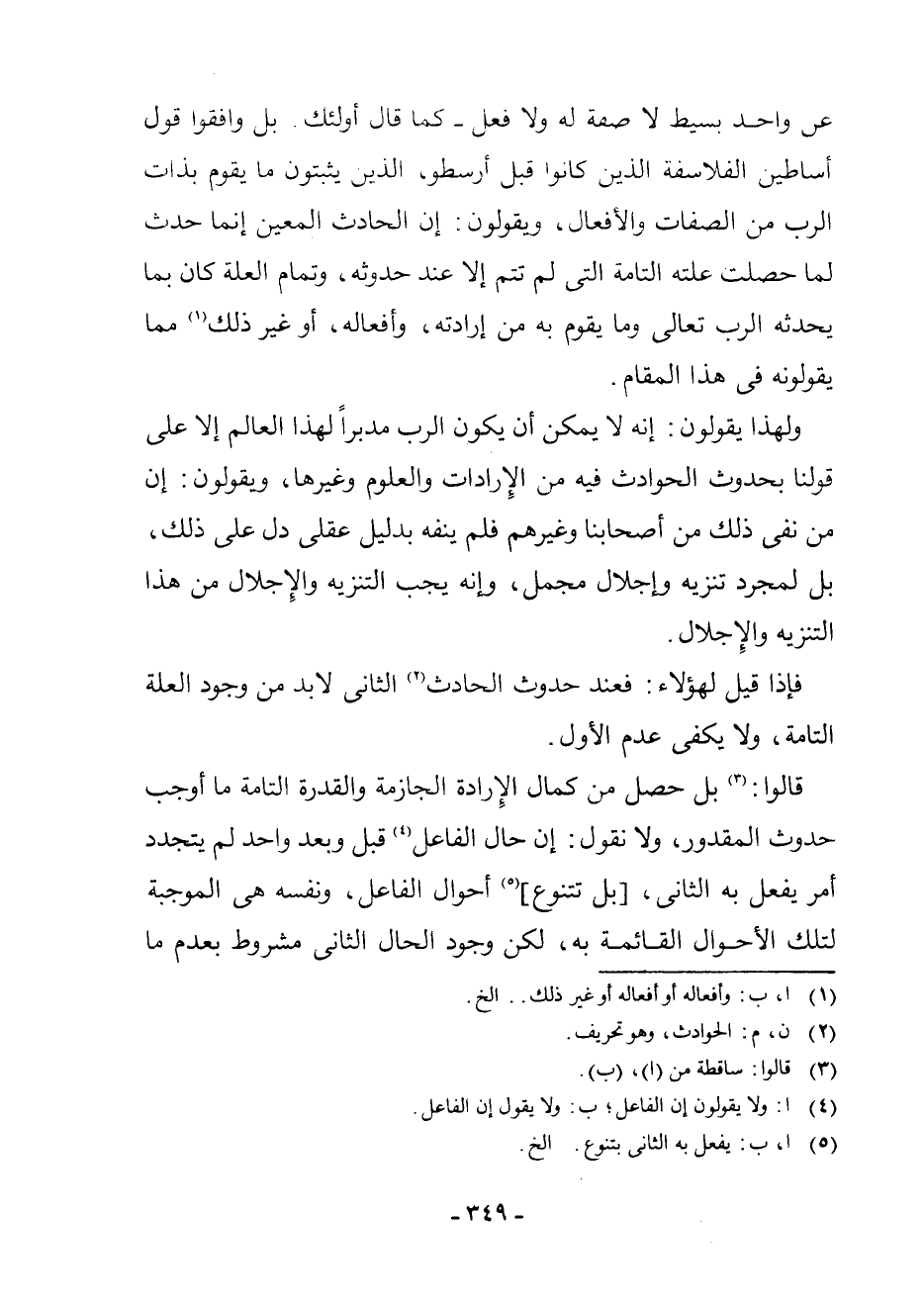 عَنْ وَاحِدٍ بَسِيطٍ لَا صِفَةَ لَهُ وَلَا فِعْلَ كَمَا قَالَ أُولَئِكَ، بَلْ وَافَقُوا قَوْلَ أَسَاطِينِ الْفَلَاسِفَةِ الَّذِينَ كَانُوا قَبْلَ أَرِسْطُو الَّذِينَ يُثْبِتُونَ مَا يَقُومُ بِذَاتِ الرَّبِّ مِنَ الصِّفَاتِ وَالْأَفْعَالِ، وَيَقُولُونَ: إِنَّ الْحَادِثَ الْمُعَيَّنَ إِنَّمَا حَدَثَ لَمَّا حَصَلَتْ عِلَّتُهُ التَّامَّةُ الَّتِي لَمْ تَتِمَّ إِلَّا عِنْدَ حُدُوثِهِ، وَتَمَامُ الْعِلَّةِ كَانَ بِمَا يُحْدِثُهُ الرَّبُّ تَعَالَى وَمَا يَقُومُ بِهِ مِنْ إِرَادَتِهِ وَأَفْعَالِهِ، أَوْ غَيْرِ ذَلِكَ (¬1) مِمَّا يَقُولُونَهُ فِي هَذَا الْمَقَامِ.