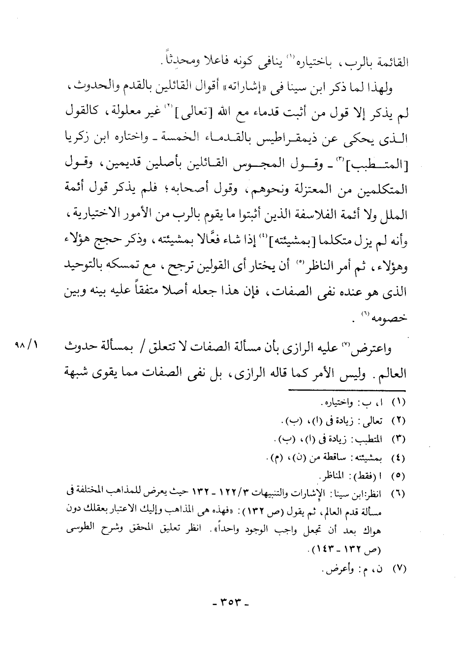 (¬6) انْظُرِ ابْنَ سِينَا: الْإِشَارَاتِ وَالتَّنْبِيهَاتِ 3/122 - 132 حَيْثُ يَعْرِضُ لِلْمَذَاهِبِ الْمُخْتَلِفَةِ فِي مَسْأَلَةِ قِدَمِ الْعَالَمِ، ثُمَّ يَقُولُ (ص [0 - 9] 32) : " فَهَذِهِ هِيَ الْمَذَاهِبُ وَإِلَيْكَ الِاعْتِبَارُ بِعَقْلِكَ دُونَ هَوَاكَ بَعْدَ أَنْ تَجْعَلَ وَاجِبَ الْوُجُودِ وَاحِدًا ". انْظُرْ تَعْلِيقَ الْمُحَقِّقِ وَشَرْحَ الطُّوسِيِّ (ص [0 - 9] 32 - 143) .