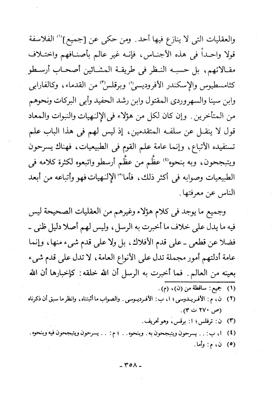 وَالْعَقْلِيَّاتِ الَّتِي لَا يُنَازِعُ فِيهَا أَحَدٌ. وَمَنْ حَكَى عَنْ [جَمِيعِ] (¬1) الْفَلَاسِفَةِ قَوْلًا وَاحِدًا فِي هَذِهِ الْأَجْنَاسِ، فَإِنَّهُ غَيْرُ عَالِمٍ بِأَصْنَافِهِمْ وَاخْتِلَافِ مَقَالَاتِهِمْ، بَلْ حَسْبُهُ النَّظَرُ فِي طَرِيقَةِ الْمَشَّائِينَ أَصْحَابِ أَرِسْطُو كَثَامِسْطِيُوسَ وَالْإِسْكَنْدَرِ الْأَفْرُودِيسِيِّ (¬2) وَبَرْقَلْسَ (¬3) مِنَ الْقُدَمَاءِ، وَكَالْفَارَابِيِّ وَابْنِ سِينَا وَالسُّهْرَوَرْدِيِّ الْمَقْتُولِ وَابْنِ رُشْدٍ الْحَفِيدِ وَأَبِي الْبَرَكَاتِ وَنَحْوِهِمْ مِنَ الْمُتَأَخِّرِينَ. وَإِنْ كَانَ لِكُلٍّ مِنْ هَؤُلَاءِ فِي الْإِلَهِيَّاتِ وَالنُّبُوَّاتِ وَالْمَعَادِ قَوْلٌ لَا يَنْقِلُ عَنْ سَلَفِهِ الْمُتَقَدِّمِينَ، إِذْ لَيْسَ لَهُمْ فِي هَذَا الْبَابِ عِلْمٌ تَسْتَفِيدُهُ الْأَتْبَاعُ، وَإِنَّمَا عَامَّةُ عِلْمِ الْقَوْمِ فِي الطَّبِيعِيَّاتِ، فَهُنَاكَ يُسَرِّحُونَ وَيَتَبَجَّحُونَ، وَبِهِ بِنَحْوِهِ (¬4) عَظَّمَ مَنْ عَظَّمَ أَرِسْطُو، وَاتَّبَعُوهُ؛ لِكَثْرَةِ كَلَامِهِ فِي الطَّبِيعِيَّاتِ وَصَوَابِهِ فِي أَكْثَرِ ذَلِكَ، فَأَمَّا (¬5) الْإِلَهِيَّاتُ فَهُوَ وَأَتْبَاعُهُ مِنْ أَبْعَدِ النَّاسِ عَنْ مَعْرِفَتِهَا.