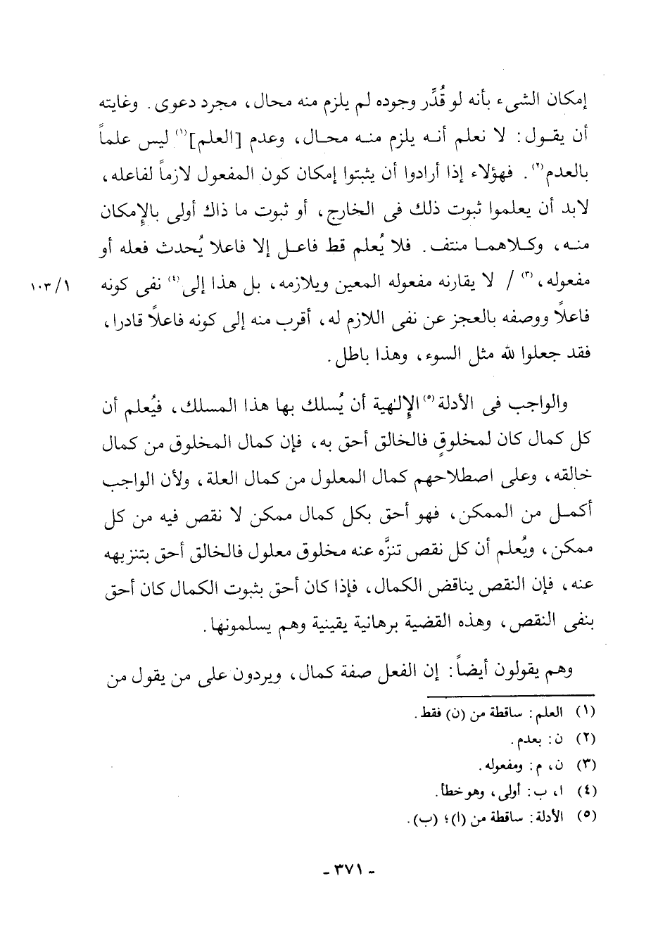 إِمْكَانَ الشَّيْءِ بِأَنَّهُ لَوْ قُدِّرَ وُجُودُهُ لَمْ يَلْزَمْ مِنْهُ مُحَالٌ، مُجَرَّدُ دَعْوَى. وَغَايَتُهُ أَنْ يَقُولَ: لَا نَعْلَمُ أَنَّهُ يَلْزَمُ مِنْهُ مُحَالٌ، وَعَدَمُ [الْعِلْمِ] (¬1) لَيْسَ عِلْمًا بِالْعَدَمِ (¬2) ، فَهَؤُلَاءِ إِذَا أَرَادُوا أَنْ يُثْبِتُوا إِمْكَانَ كَوْنِ الْمَفْعُولِ لَازِمًا لِفَاعِلِهِ، لَا بُدَّ أَنْ يَعْلَمُوا ثُبُوتَ ذَلِكَ فِي الْخَارِجِ، أَوْ ثُبُوتَ مَا ذَاكَ أَوْلَى بِالْإِمْكَانِ مِنْهُ، وَكِلَاهُمَا مُنْتَفٍ. فَلَا يُعْلَمُ قَطُّ فَاعِلٌ إِلَّا فَاعِلًا يُحْدِثُ فِعْلَهُ أَوْ مَفْعُولَهُ، (¬3) لَا يُقَارِنُهُ مَفْعُولُهُ الْمُعَيَّنُ وَيُلَازِمُهُ، بَلْ هَذَا إِلَى (¬4) نَفْيِ كَوْنِهِ فَاعِلًا وَوَصْفِهِ بِالْعَجْزِ عَنْ نَفْيِ اللَّازِمِ لَهُ، أَقْرَبُ مِنْهُ إِلَى كَوْنِهِ فَاعِلًا قَادِرًا، فَقَدْ جَعَلُوا اللَّهَ مَثَلَ السَّوْءِ، وَهَذَا بَاطِلٌ.