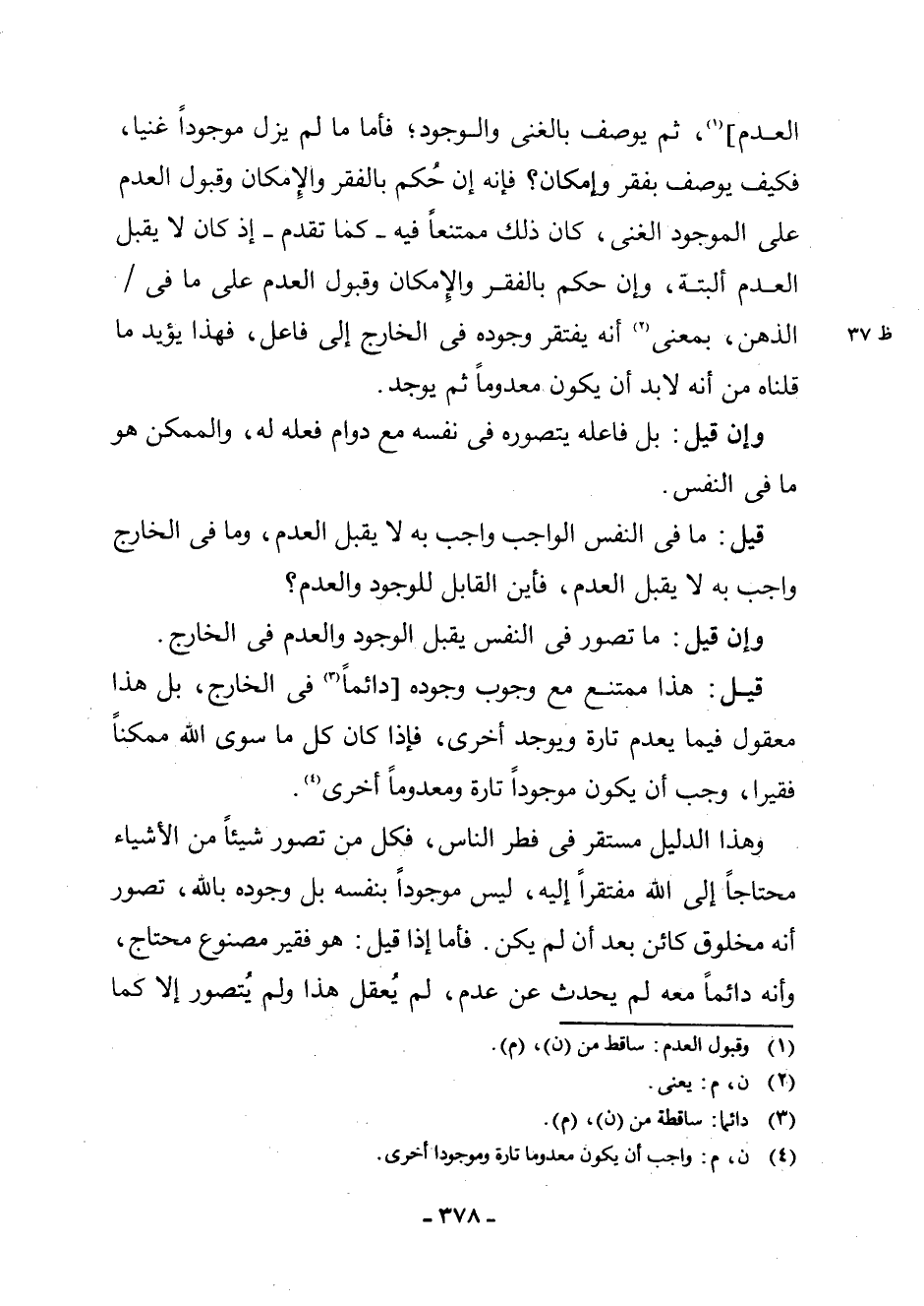 قِيلَ: هَذَا مُمْتَنَعٌ مَعَ وُجُوبِ وَجُودِهِ [دَائِمًا (¬3) فِي الْخَارِجِ، بَلْ هَذَا مَعْقُولٌ فِيمَا يُعْدَمُ تَارَةً وَيُوجَدُ أُخْرَى، فَإِذَا كَانَ كُلُّ مَا سِوَى اللَّهِ مُمْكِنًا فَقِيرًا، وَجَبَ أَنْ يَكُونَ مَوْجُودًا تَارَةً وَمَعْدُومًا أُخْرَى (¬4) .